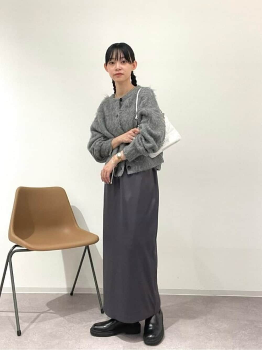 【カーディガン】存在感抜群なフェザーカーディガン。収まりの良い着丈でロングスカート合わせも⌾ 【ワンピース】ストレートラインのキャミワンピース。くすみカラーとサテンの光沢で上品な印象に。 【ブーツ】着脱が楽なサイドゴアブーツ。つま先にかけてのカーブが大人も挑戦しやすいです♩ 【バッグ】ナイロン素材と付属のチェーンでコーデを旬なバランスに仕上げてくれます。