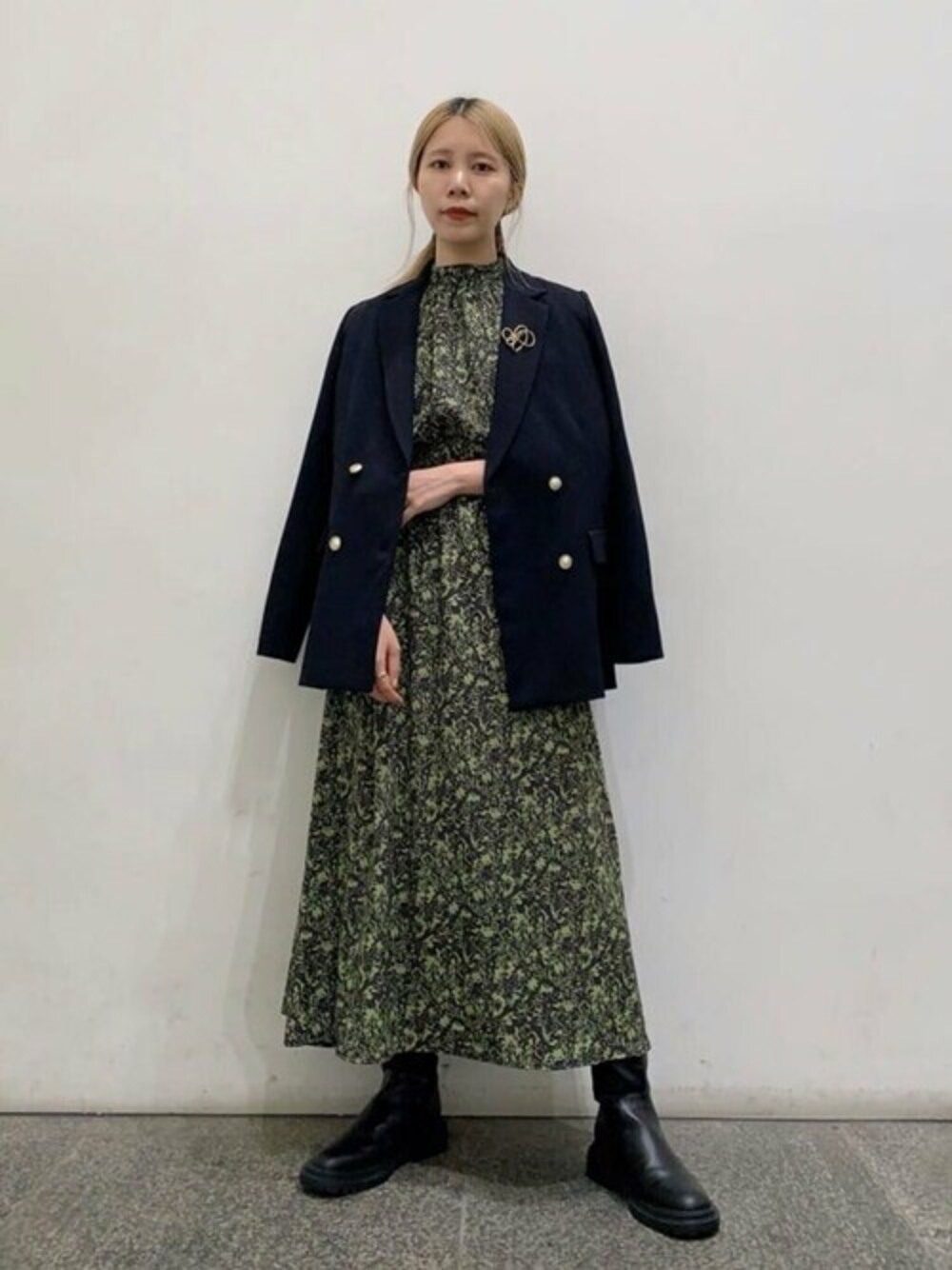 ※着用写真のジャケットは店舗限定のダブルブレストテーラードジャケット(166-3250900)で、EC限定のダブルブレストテーラードジャケット(166-3250901)とは、ボタンのデザインが異なります。 ワンピースは珍しい配色のこちらのカラーがなんば店では1番人気です。 156cm Mサイズ着用で足首上くらいの着丈になります。