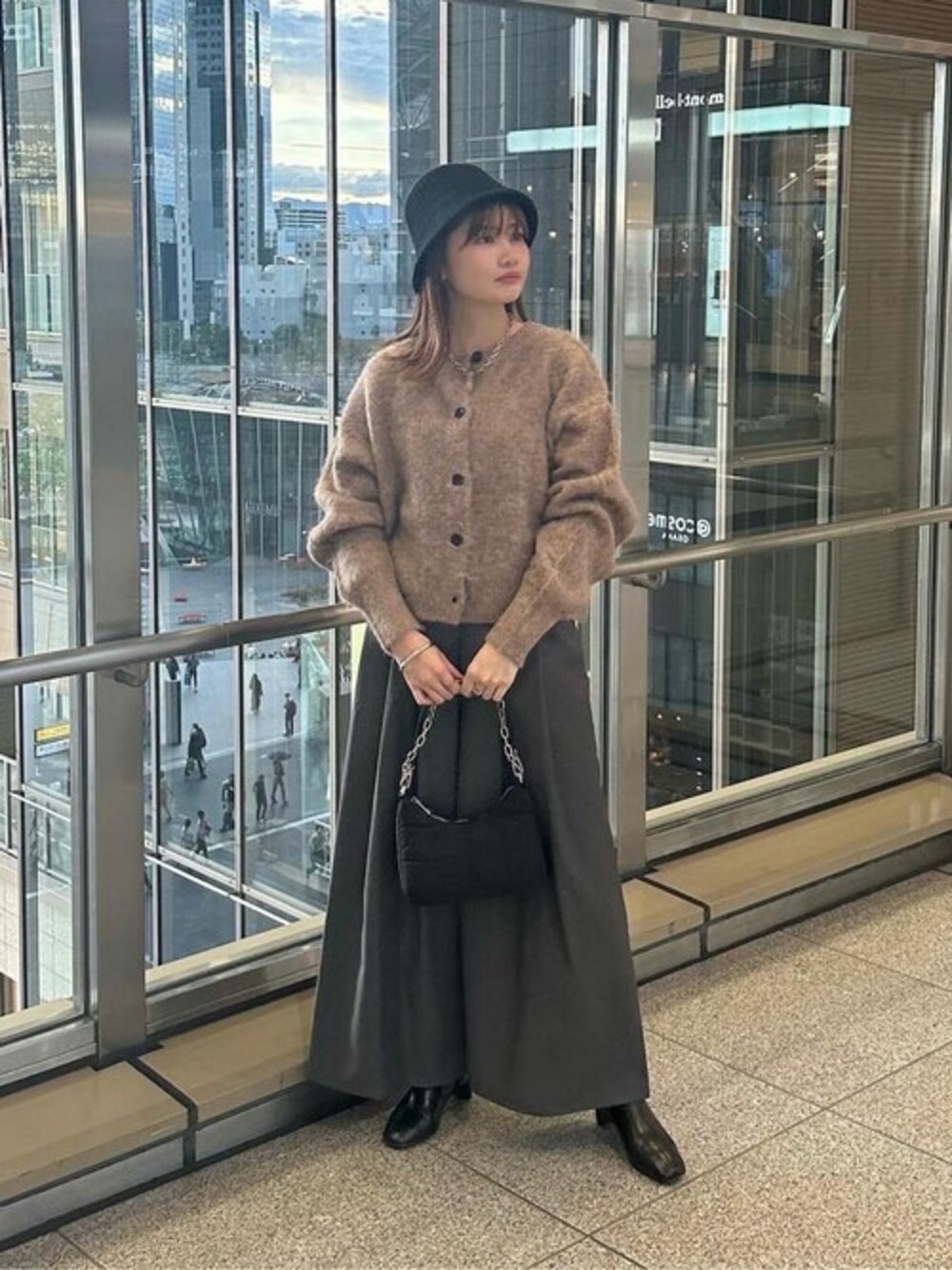 【クルーネックフェザーカーディガン】 【素材感、着心地】 毛足も長くふわふわとした柔らかい素材感です。やや肉厚ですが重みもなくちょっとした羽織にもピッタリです♩ 【サイズ感】 Mワンサイズ、158cmでヒップにかかる丈感です。袖や身幅にはゆとりがあるのでインナーは気にせずレイヤードして頂けます♡ 【スタイリングポイント】 柔らかなベージュに今季トレンドのグレーのワイドパンツを合わせた大人カジュアルコーデに仕上げました♩ ****年齢20代前半/158cm/普通サイズM /パーソナルカラー:ブルベ冬/骨格ストレート/足のサイズ:23.5*****