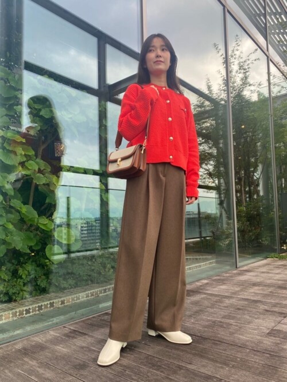 1枚で存在感のあるニット♡ キラキラしたゴールドボタンもアクセントになっており、コーディネートの主役になります! ボタンを全部開けてカーディガンとして着ていただいても◎デニム合わせも可愛いです♡ 今回はブラウンのボトムスと合わせてこれからの季節にピッタリな秋の大人カジュアルコーディネートにしました!