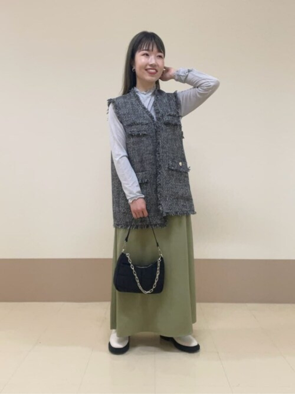 <ジレ・カットソーフリーサイズ,スカートSサイズ> ツイードジレ×マットサテンスカートの組み合わせで大人っぽくカジュアルに♡ インナーは流行りのラメカットソーでさりげないキラッと感がコーデを引き締めてくれます。 スカートはSサイズもご用意あるので、丈感合わせやすく、ウエストは背中側がゴムになっていて楽に着ていただけます! [身長151センチ/骨格ウェーブ]