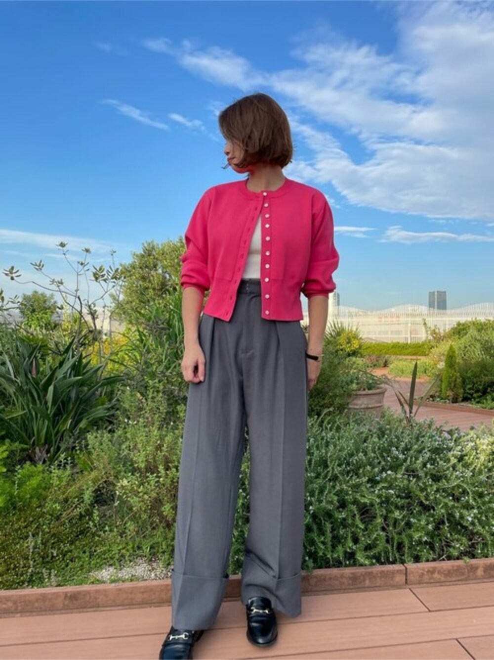 気分の上がるピンクのカーディガンを主役に、今期トレンドのグレーボトムを合わせてみました! カーディガンはボタンを全部閉めて、インナーにシアーカットソーをレイヤードさせても可愛いです♪ 【身長162cm/30代前半/イエベ春/骨格ストレート/アトレ恵比寿】