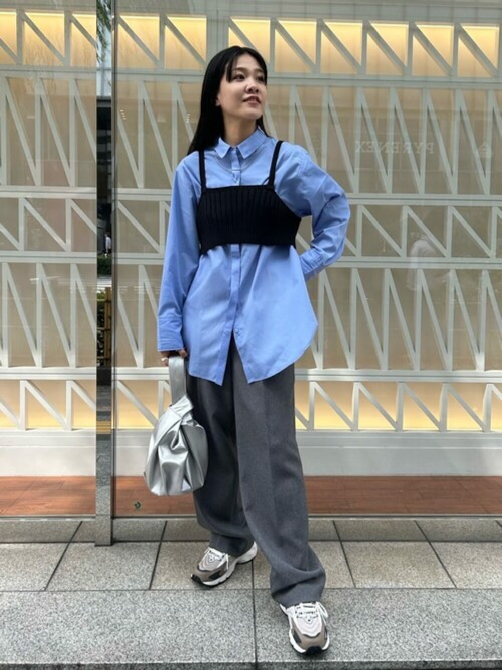 <トップスワンサイズ・パンツSサイズ着用> ブルーシャツ×グレーパンツで今年らしいハンサムスタイルに仕上げてみました♡トップスは少し長めの丈感で、コンパクトなニットビスチェとのバランスがバッチリ◎一気にオシャレ見えしてくれるオススメアイテムです! ...160cm/イエベ秋/骨格ウェーブ/20代後半...