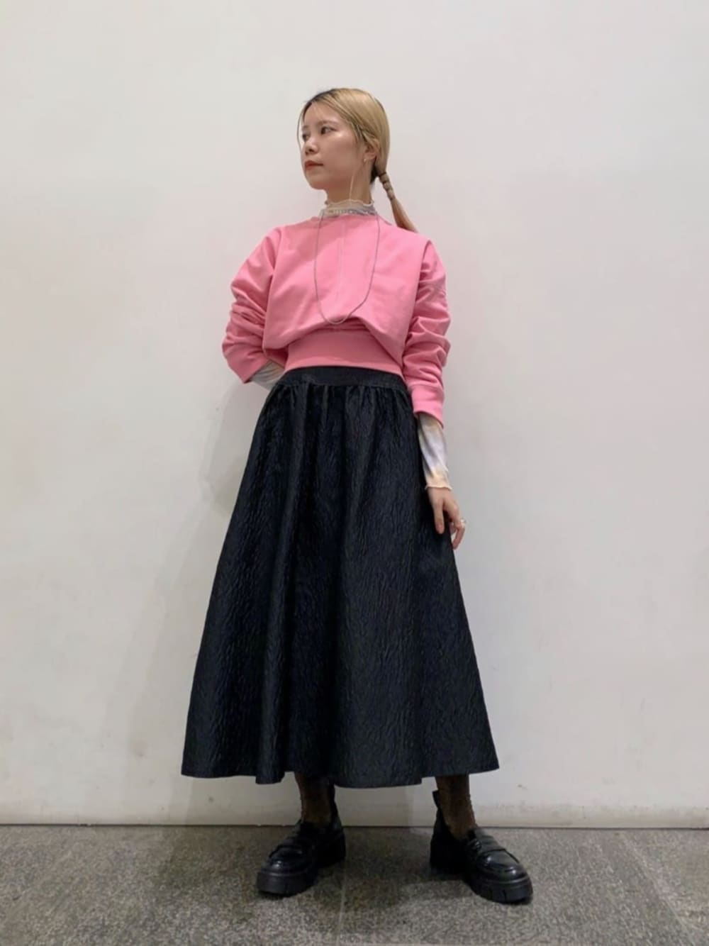 かわいいカラーのスウェットが入荷致しました。中にトレンドのシアー系インナーをレイヤードしてもかわいいと思います。 スカートのシルエットが見えるように、TOPSの裾を絞って写真を撮りましたが、着丈はヒップに少しかかるくらいの着丈になります。