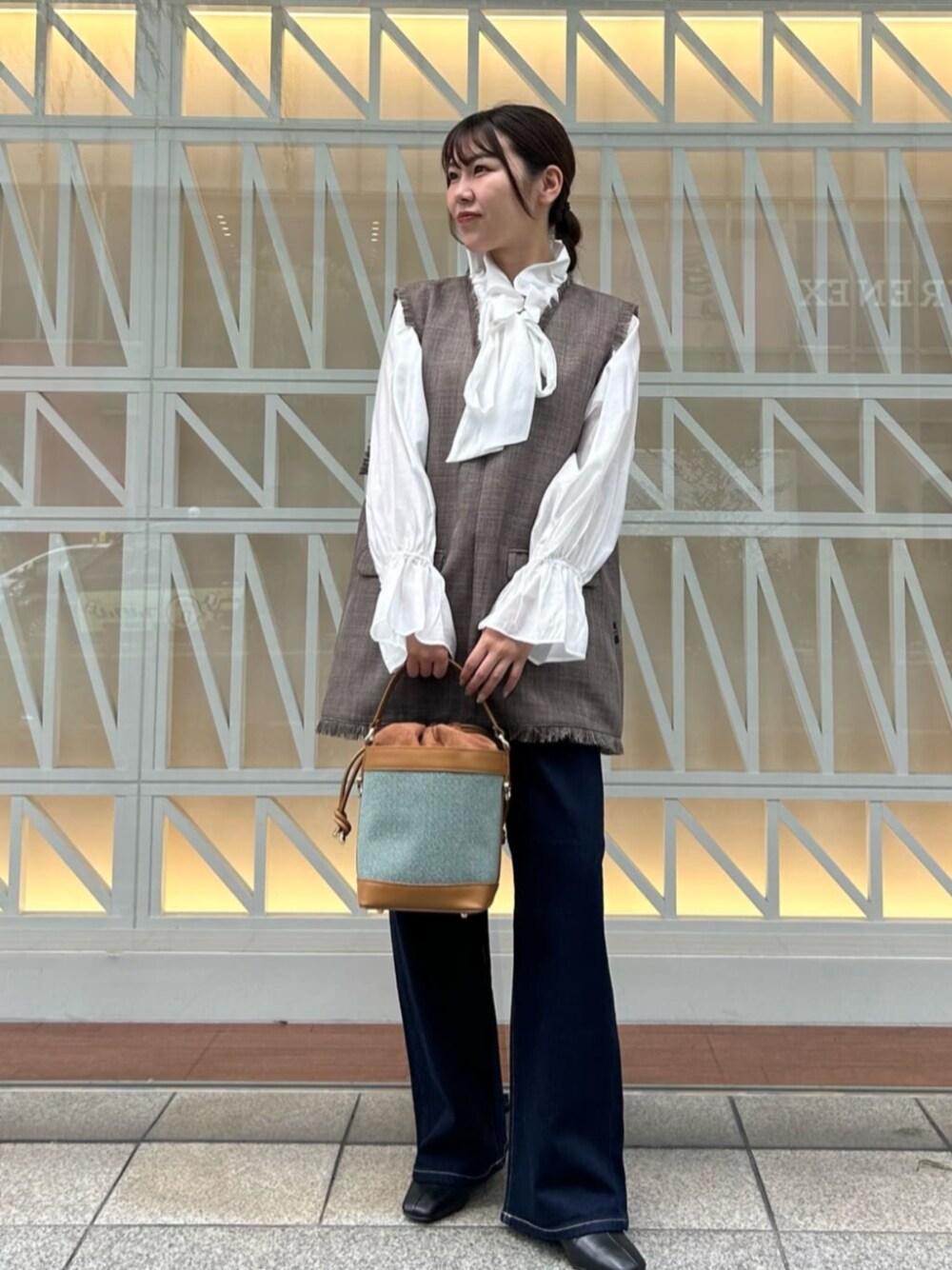 【ブラウス/ジレ】 ボリュームのある襟付きブラウスは顔の印象を華やかに見せてくれてます♡ツイードジレは、季節の変わり目に最適でインナー変えるだけで雰囲気も変えられますし、長く使用できるアイテム!フリンジディテールはトレンド感が出てとても可愛いです! 【パンツ】 体のラインを拾わずに使用できます♡ サイズ展開も豊富で、低身長の私にはとても嬉しいです!