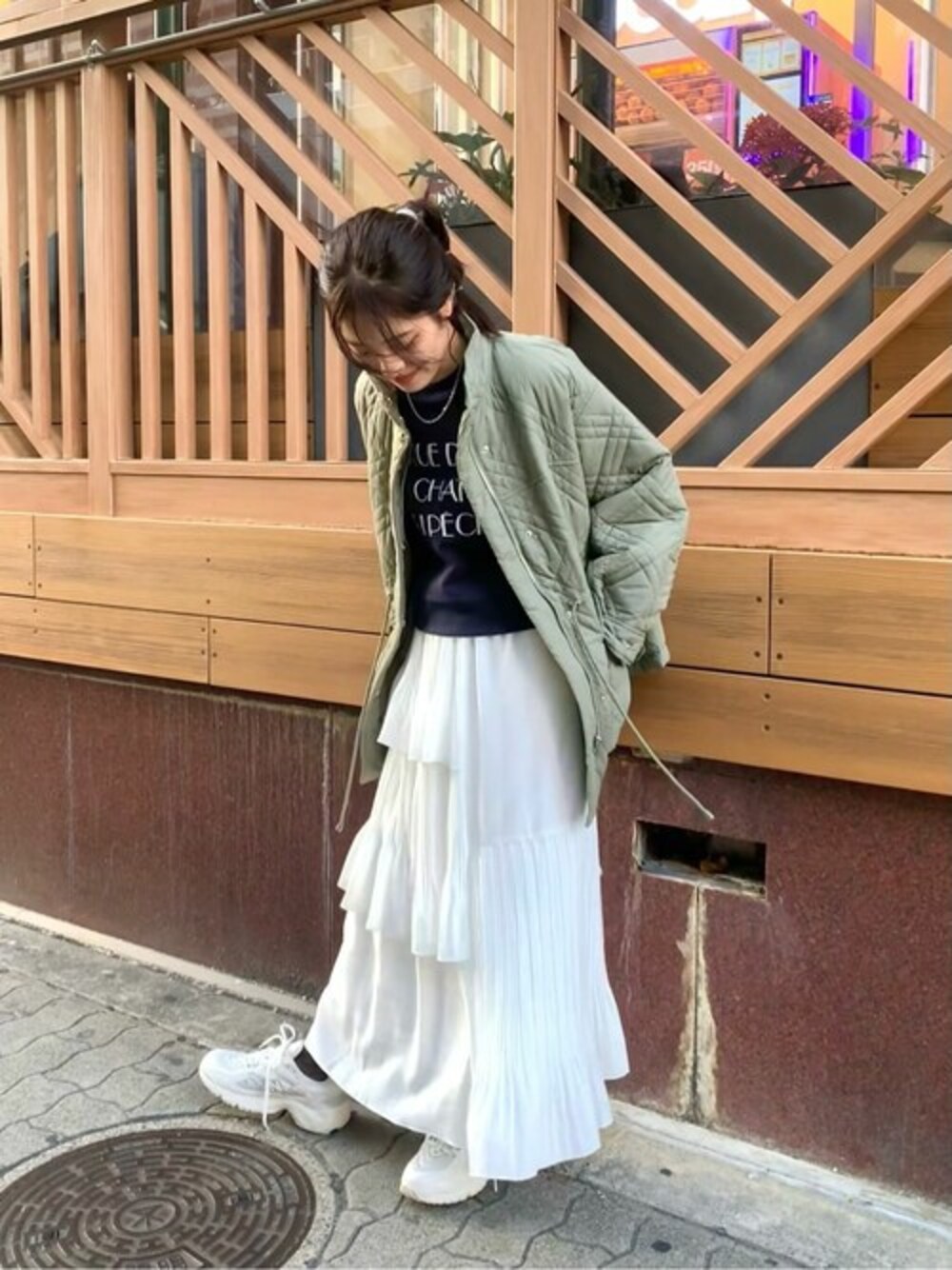 ○キルティングブルゾン 日中も肌寒くなってきた今着たい、スタンドネックのブルゾン♥ キルティングデザインが細かく、可愛くなりすぎないのもポイントです♪ 【サイズ感】Mサイズ お尻がしっかり隠れる丈感。 アジャスター付きでウエストが絞れるので、スッキリ着られ、小柄な方にもオススメです◎ 【素材】 シャカシャカとした生地で風を通しにくく、しっかり暖かいのにサラッと羽織れる軽さも嬉しいポイントです◎ 【コーディネート】 カーキのキルティングブルゾン×ホワイトのティアードスカートで少し甘めに。トレーナーとスニーカー合わせで、程よい甘さを残しつつ、カジュアルに仕上げてみました♡ staff: 20代前半/161cm/イエベ春/骨格ナチュラル
