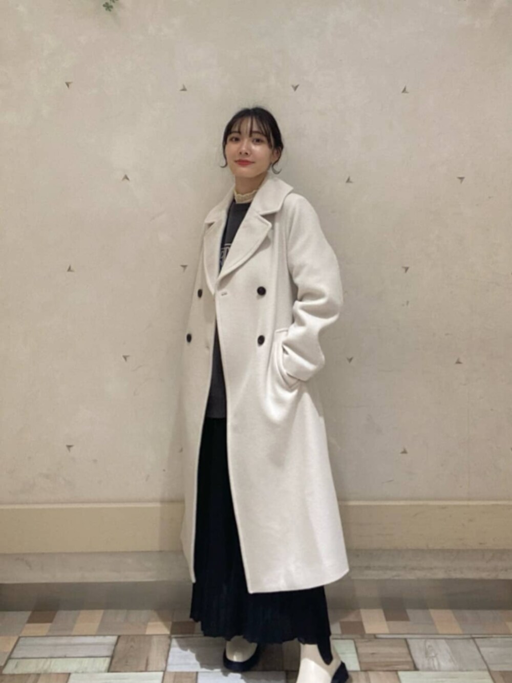 この冬イチオシなコートをメインに大人なカジュアルコーディネートにしてみました☺︎ ダブルボタンが印象的で、付属の共布ベルトは後ろで結ぶと前を開けた時にすっきり見えするのでオススメです! 150cm代には嬉しいSサイズも展開があるので、中に合わせるスカートとやボトムスともバランスよくお召しいただけます◎ 大きめの襟はしっかり暖かくて、更に小顔効果も抜群で嬉しい事づくし♪ 【コート着用/ Sサイズ】 中に合わせたプリーツスカートは程よいシアー感でフェミニンにもカジュアルにも見せてくれる優秀アイテム◎ トレンドカラーのグレーのロゴニットやゴアブーツと合わせてカジュアルダウンさせるのがN.らしくてオススメです♡ 【ニット・スカート着用/ワンサイズ】 【ブーツ着用/Mサイズ】 staff*20代前半/158cm/イエベ秋/骨格ナチュラル