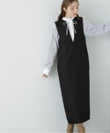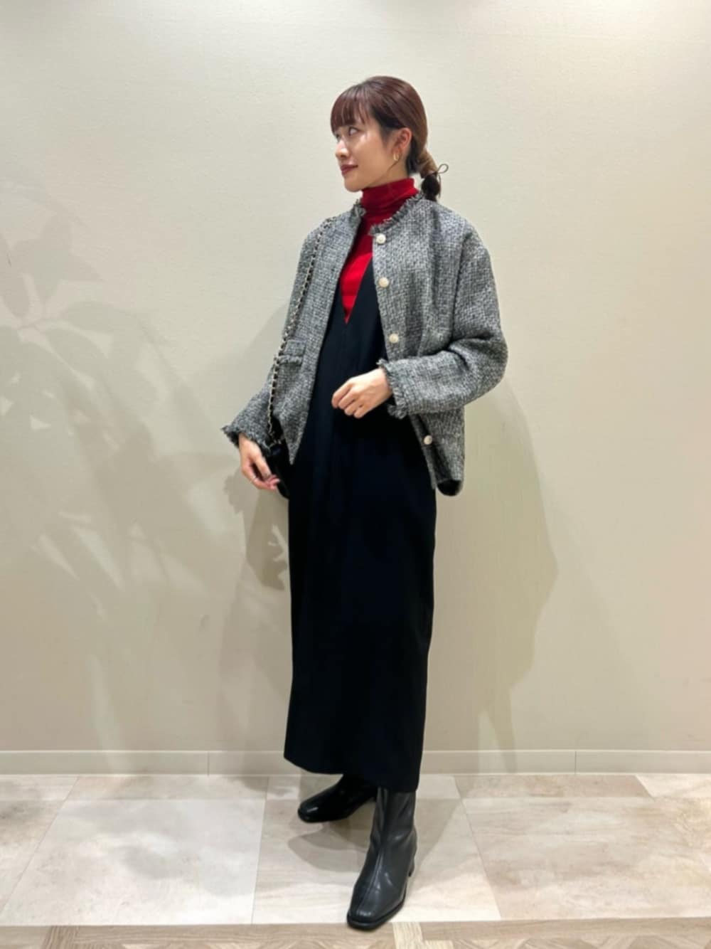 【着心地・サイズ感】トレンドのツイードジャケットは肩を落としたややオーバーなデザインで羽織りやすく、身長161cmでSを着用してピッタリでした! 大人気のジャンスカは首元キーネックでスッキリと見え、ラインを拾わないシルエットなので華奢見え効果も抜群です。 後ろもスリット深めに入っているので歩きやすく、SM展開なので小柄な方でも安心な丈感です。 【スタイリングポイント】秋と言えば赤☺︎ カラーニットを主役にコーデを組んでみました。ジャンスカはインナー変えるだけで雰囲気ガラリと変えられるので1着あると便利です♪♪