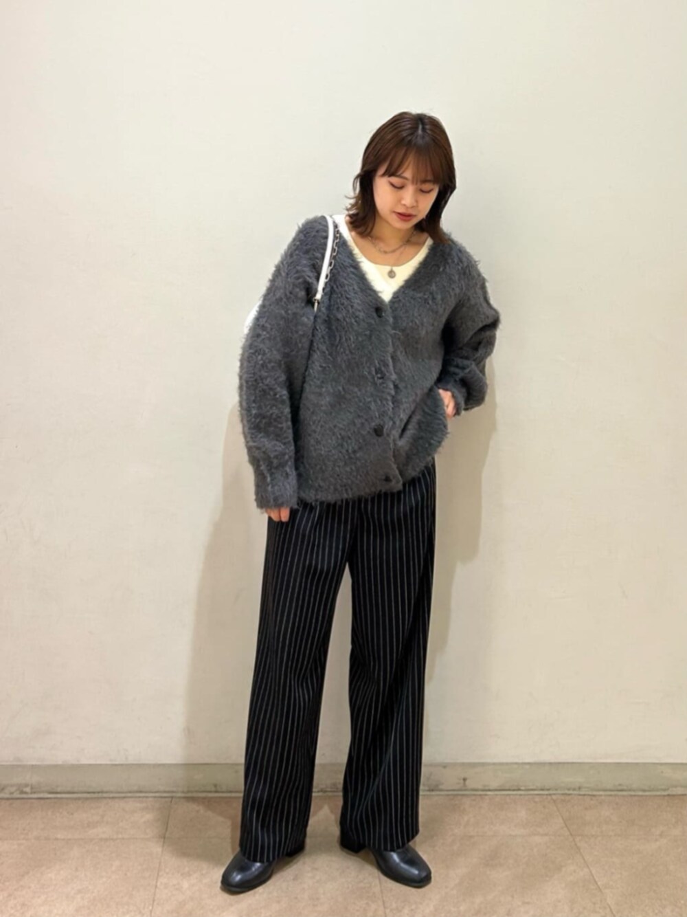とにかく着心地抜群のフェザーニットカーデ!スラックスと合わせて大人カジュアルなコーディネートに仕上げてみました。ふわふわの柔らかい肌触りと素材で真冬まで長くお使い頂けます♪ タイトめなスカートと合わせるのも可愛いですね!