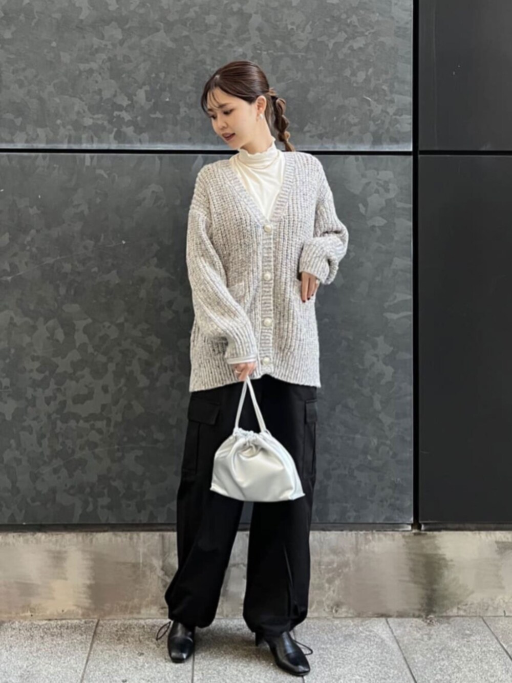 【素材感、着心地】 色々な色の糸が混じっていてラメ感はあるものの、キラキラすぎないので大人の方でも着やすい素材感です。 柔らかく動きやすい着心地です⭐︎ ボタンの色味がシルバーアクセとも相性がいいのもポイントです♩ 【サイズ感】 166cm Mサイズでヒップ下の丈感です 【コーディネートポイント】 カーディガン×パラシュートパンツでリラックス感を意識したコーディネートです。 **年齢:20代前半/身長:166cm/骨格:ウェーブ/パーソナルカラー:イエベ秋**
