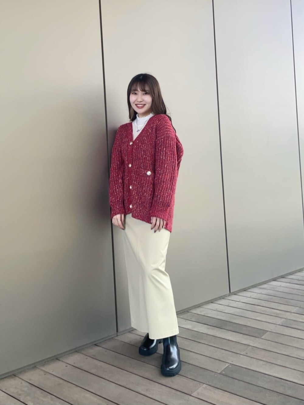【カーディガン:ワンサイズ、スカート:S(S/M)】ラメ糸が織り込まれた今季らしいカーディガンです❤︎ヒップまで隠れるので腰回りも安心で、パンツ合わせでマニッシュなスタイルもオススメです♪スカート(フェイクレザーハイウエストストレートスカート/166-3220102)は157cmの私がSサイズを着用するとくるぶしより上の丈感です!*****20代前半/157cm/ブルベ夏/骨格ウェーブ*****