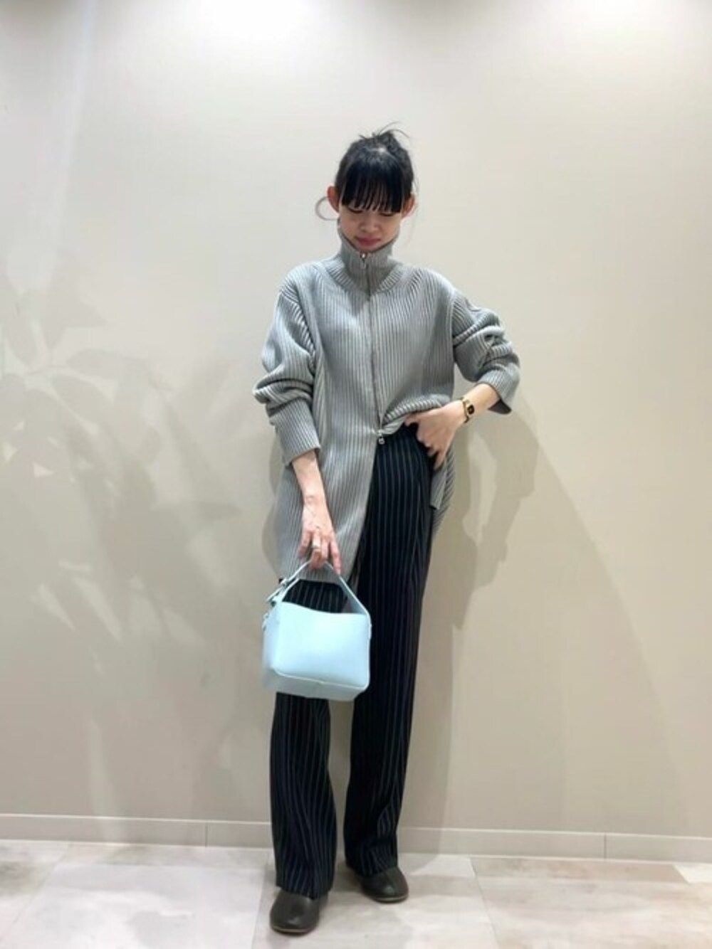 IGライブで紹介したスタイリングです♩ 【ニット】2つのZIPで好みのバランスで着られるトレンドのデザイン。ハイネックにするとアウターを羽織る時期にも可愛いです⌾裾のZIPはウエストまで上げるとスタイルUP効果抜群。 【パンツ】ストライプと軽い生地感でボリュームやデザインが強いニットと合わせるとコーデを締めてくれます。 【バッグ】角のないスクエア型が可愛いミニバッグ。 淡いブルーはトレンドのグレーとの馴染みがよくすっきりした印象に。