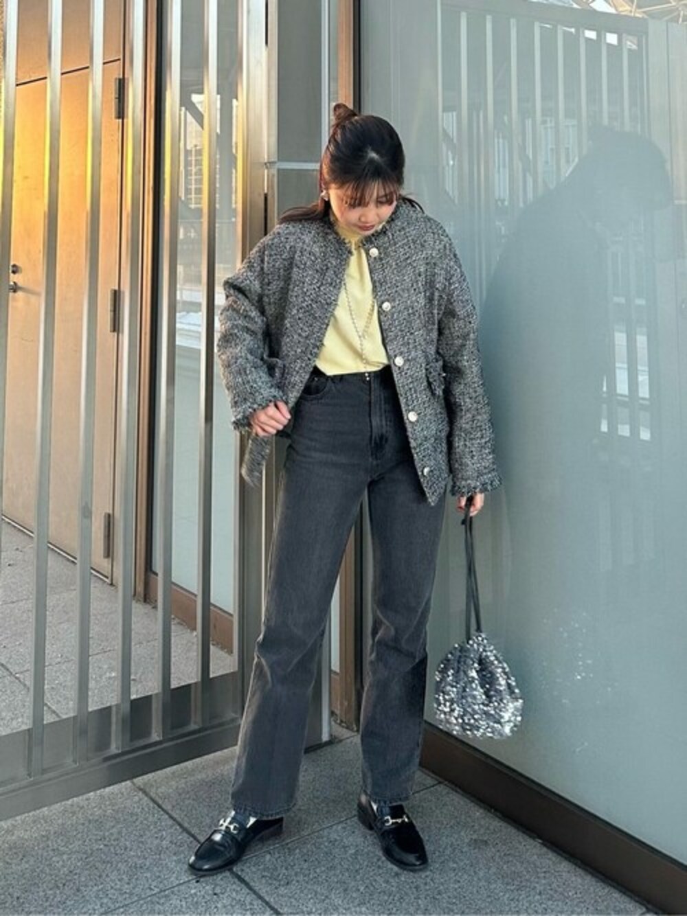 ライトツイードジャケット】 【素材感、着心地】 ツイード調で少し固めの素材感です。生地自体は厚手ではないですが裏地ありなのでコート代わりとして今の季節にピッタリです♡ 【サイズ感】 158cm、Mサイズでお尻が丁度隠れる丈感です。元々オーバーサイズなのでSサイズでも肉厚なニットやスウェットも余裕を持って入れて頂けますが私は、よりカジュアルに着こなしたくあえてMサイズにしました。 【スタイリングポイント】 カッチリしすぎないようにブラックデニムを合わせた甘辛コーデにしました♩ ****年齢20代前半/158cm/普通サイズM /パーソナルカラー:ブルベ冬/骨格ストレート/足のサイズ:23.5*****