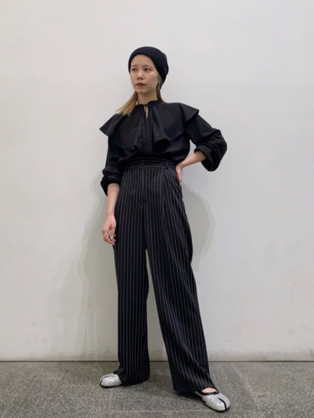 【ブラウス】中々気温が下がりきらないですが、そういう今の時期に重宝するブラウスです。襟周りのデザインがポイントなので、一枚で着て頂ける今の時期に是非挑戦して頂きたいです。 【パンツ】スカートでフェミニンに合わせるのもかわいいですが、敢えてクールなストライプパンツで◎細めなストライプなので主張しすぎず、きれいめな印象になります。