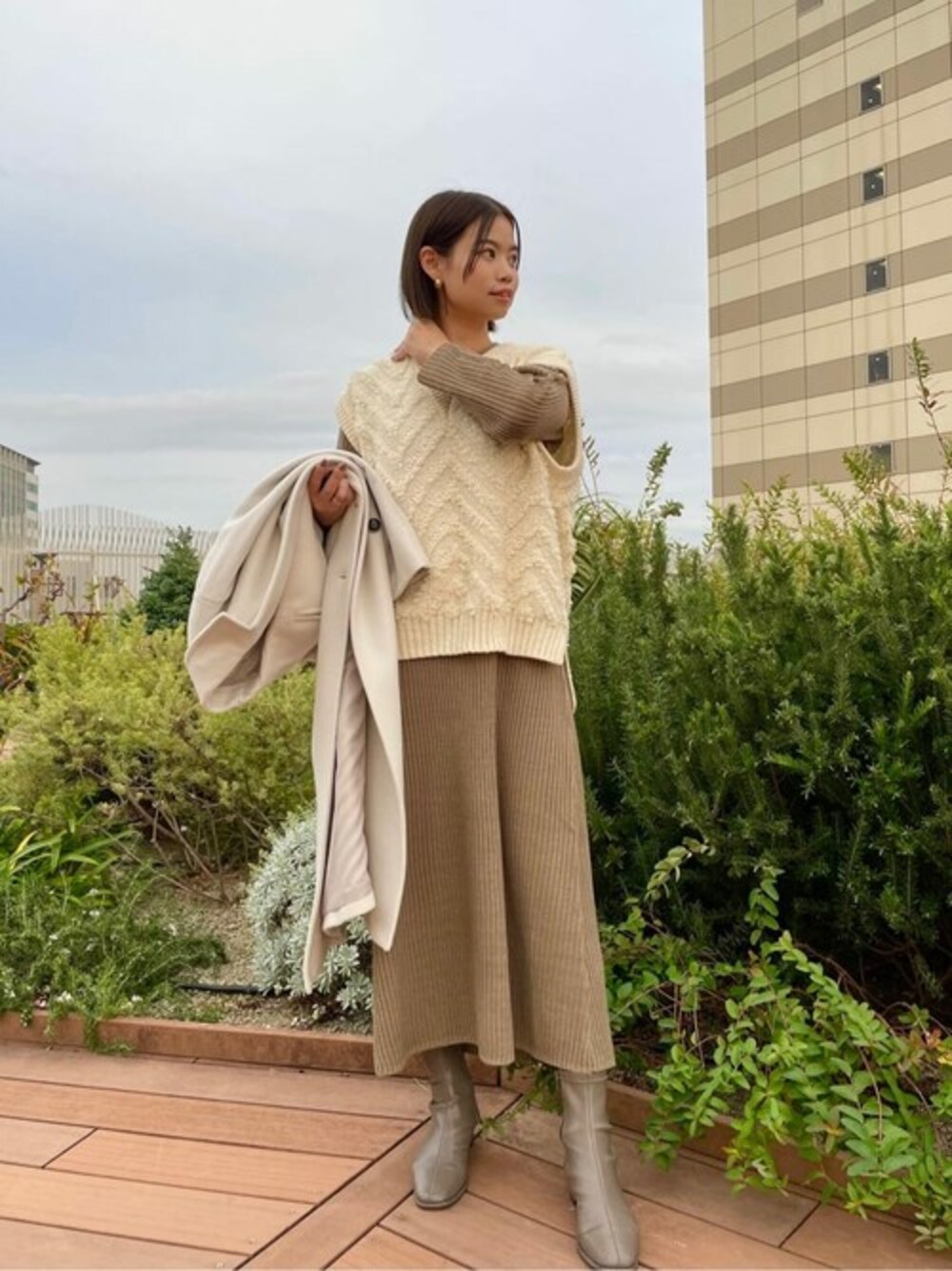 1着ですぐコーデが完成するジャガードニットベスト&ニットワンピースのセットです(^^)ニットワンピースはセミAラインなので、程良く肌離れして体型をカバーしてくれます◎N.で毎年大人気のビーバーメルトンのロングチェスターコートを合わせて、ベージュ×白の大人なスタイリングにしてみました! 【Mサイズ着用/162cm/30代前半/イエベ春/骨格ストレート/アトレ恵比寿N.】