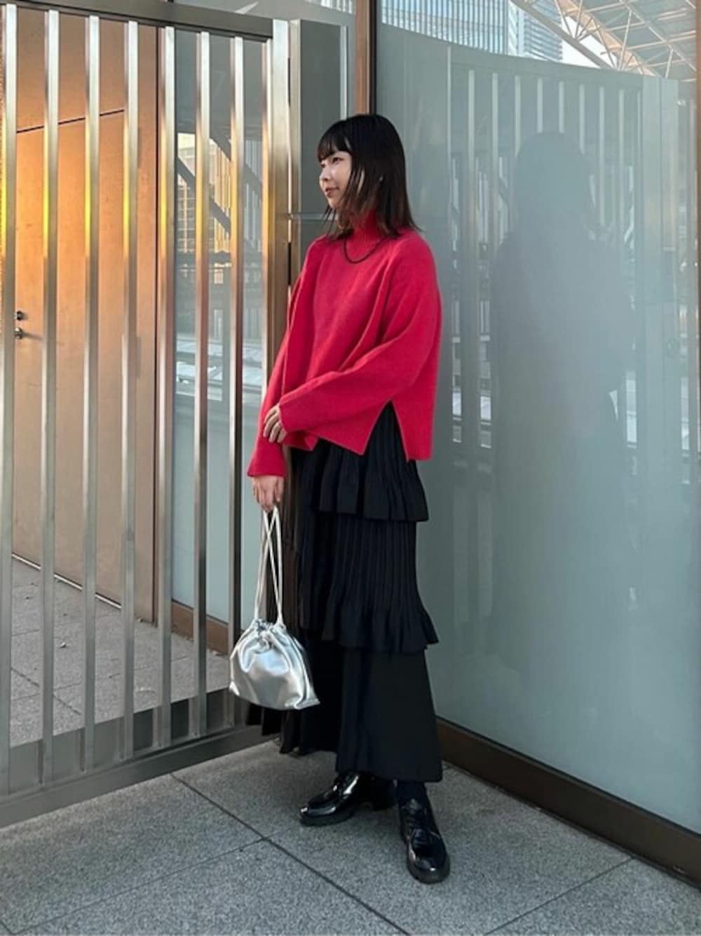 ・・ファインメリノウール混ハイネックショートニット・・ 【サイズ感】身長168cmの私で腰ラインくらいの丈感です.!! 【着心地】ハリ感のあるとても軽い着心地で、ウール混の素材なのでとても暖かかったです♡また細かい編み地でピリングが出来にくいので、ケアが楽なところが嬉しいです!! 【スタイリングポイント】パキッとしたピンクのニットを主役に、アシンメトリーデザインのワンテクあるスカートを合わせた、ちょっぴりモードな大人カジュアルコーデです☺︎