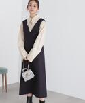 大人気のジャンパースカートが今年も登場しました♪Vネックなので首元が長くスッキリ見えし、ウエストの切り替え部分が高い位置にあるので脚長効果も期待できます!生地が厚手なので夏は暑いですが、春・秋はシャツやシアーインナー、冬はニットなど気温によって中のインナーを変えて着用できるので一枚持っておくと着回しがきいてオススメです!