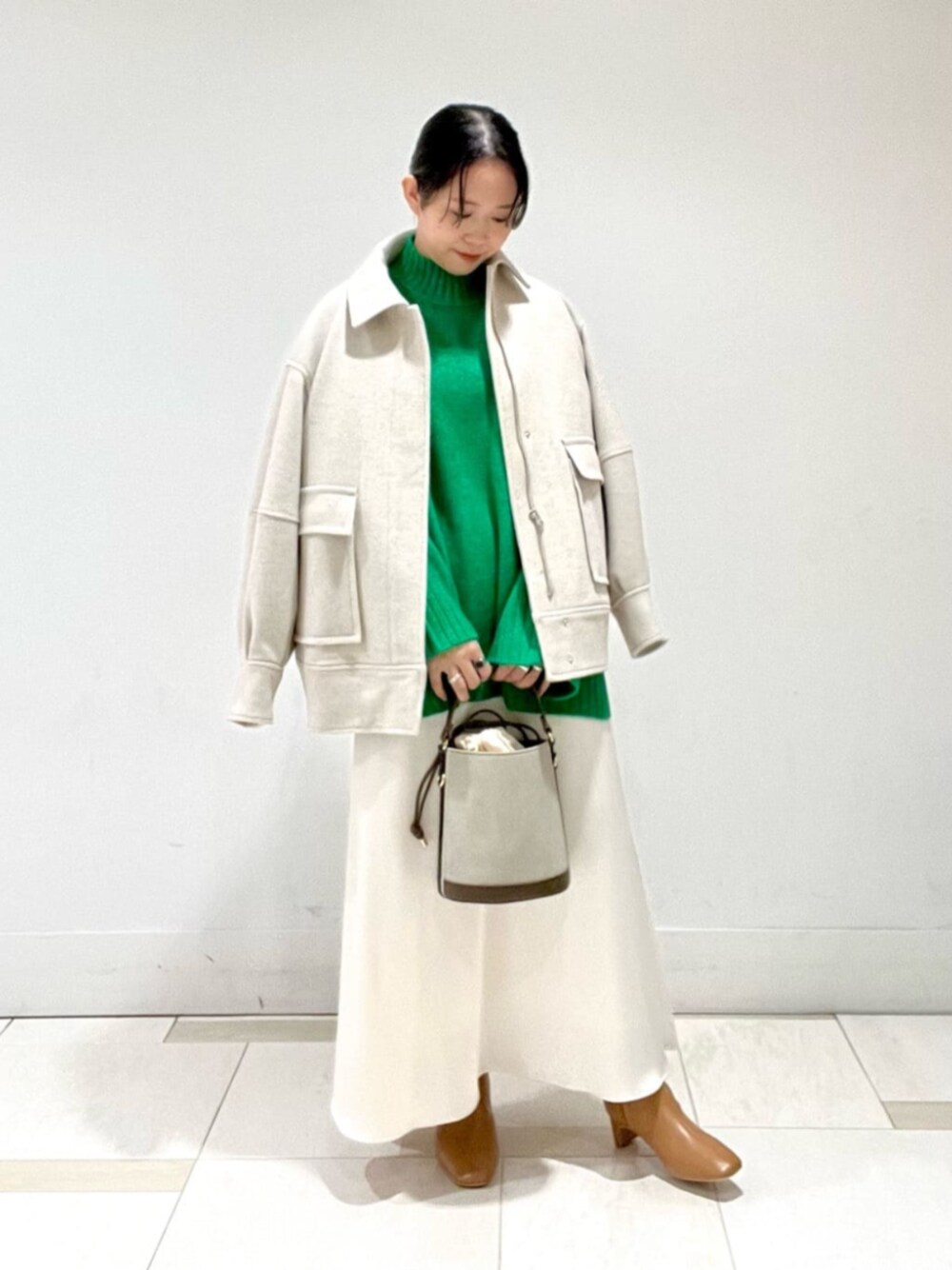 ニットのグリーンが引き立つナチュラルコーデでお出掛けはいかがでしょうか︎︎︎☺︎ 【 ニット】 たぽっとした袖シルエットが大人のリラックススタイルにピッタリです♫とても軽くチクチク感のない素材なので着ていてとても気持ちが良いです◎ ヒップラインをカバーしてくれる丈感と太めのリブが存在感あり、パンツスタイルにも相性良くお召しいただけます! 【 スカート】 凸凹とした素材感が特徴でシンプルコーデを引き立たせてくれます!154cmSサイズ着用でヒール必須な丈感でした。 【 コート】 大きく施されたポケットデザインが可愛い♩ジップの開け閉めで簡単に着脱出来てたっぽりと動きやすいシルエットなので忙しいママさんにもオススメです!