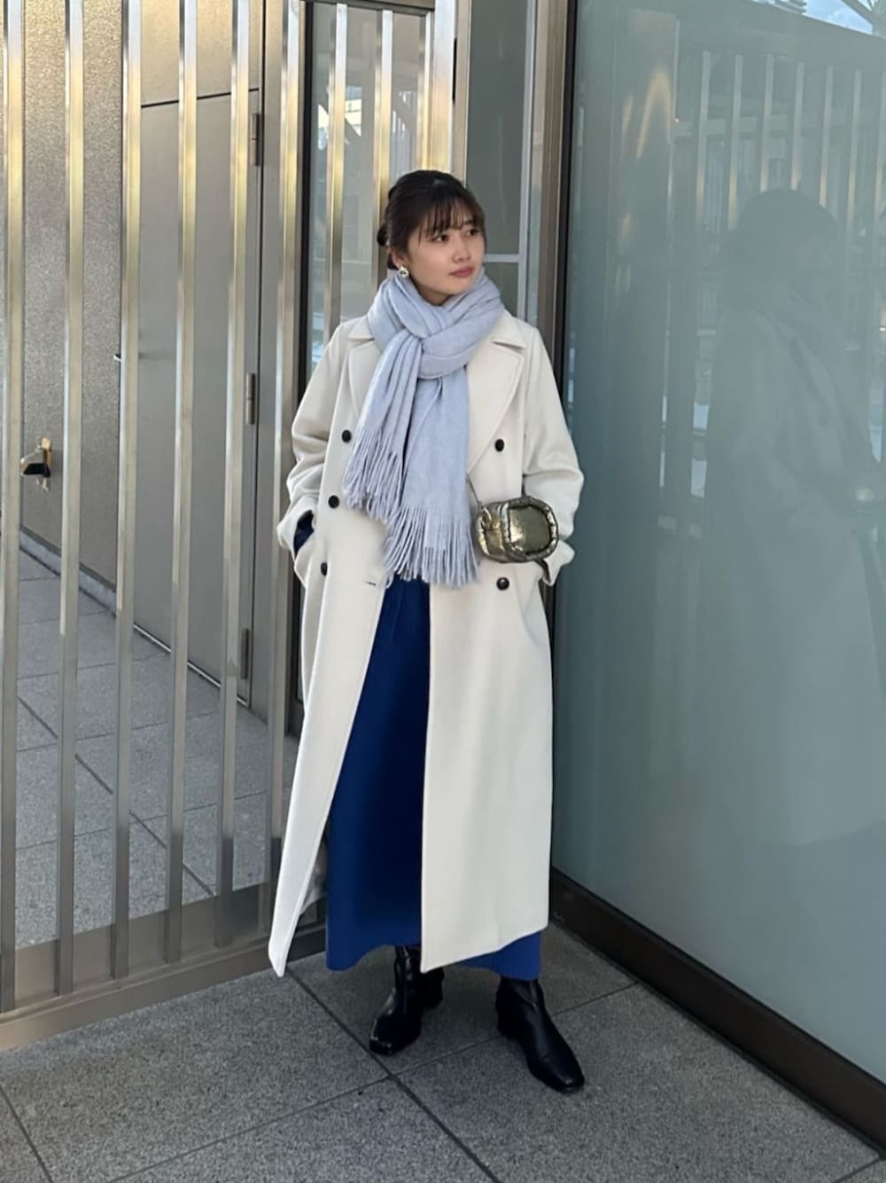 【ビーバーメルトンロングチェスターコート】 【素材感、着心地】 ウールが89%と入っており非常に暖かみがあります。N.のコートの中でも1番軽く、着て驚くほどです!! 【サイズ感】 158cm、Mサイズ着用で足首上の丈感です。身幅や袖周り等、全体的ににゆとりがありますがダブルボタンやストンとしたシルエットで縦長の効果がありロング丈ですがスラっと見せてくれます♪ 【スタイリングポイント】 チェスターなのでVで空いている為、中のインナーをブルーにしてメリハリを付けました♡ホワイトのコートなので甘くなりすぎないようにギラッとした小物を合わせて今年らしいカジュアルな印象に♪ ****年齢20代前半/158cm/普通サイズM /パーソナルカラー:ブルベ冬/骨格ストレート/足のサイズ:23.5*****