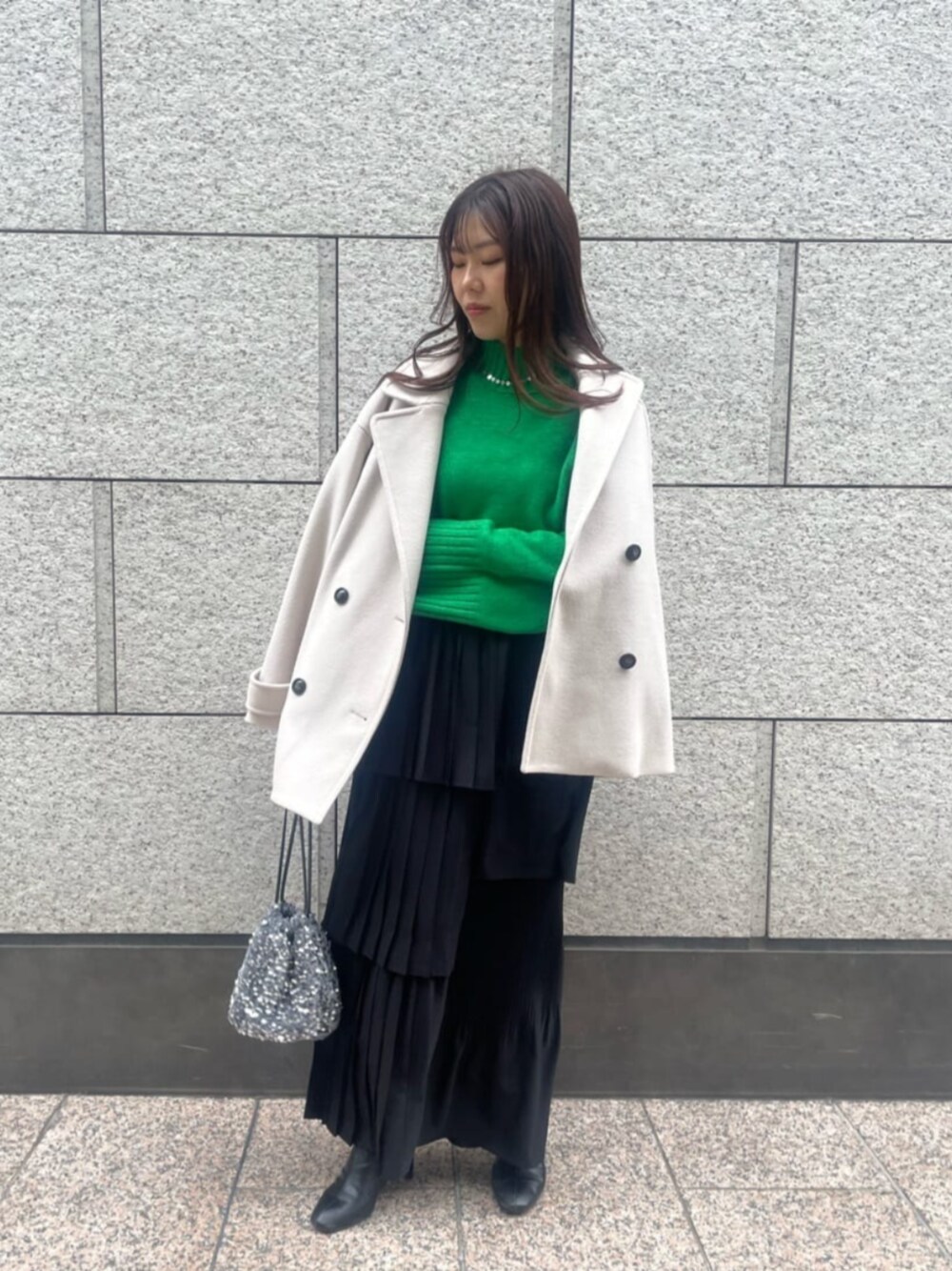 クリスマスデートコーデ♡ 【スカート】アシメトリーなレイヤードスカートは被らず特別な日に着たいアイテム!!歩くたびに揺れ感がとっても可愛いく、コーデの主役になれるスカートです!ブラックは甘めが苦手な方でも挑戦しやすいと思いますー!ウエストもゴムなので着脱も楽です! 【ニット】肌触りがとても気持ちいいカラーニット!カラー展開もとても豊富なので自分のお気に入りカラーを見つけてみてください!♡スカートにインとアウト両方撮ってみました! 【コート】シンプルなPコートは綺麗めにもカジュアルにも合わせやすいデザインです!オーバーサイズなのでSサイズでもオーバーサイズで着れるので厚手のニットなど着込んでも◎