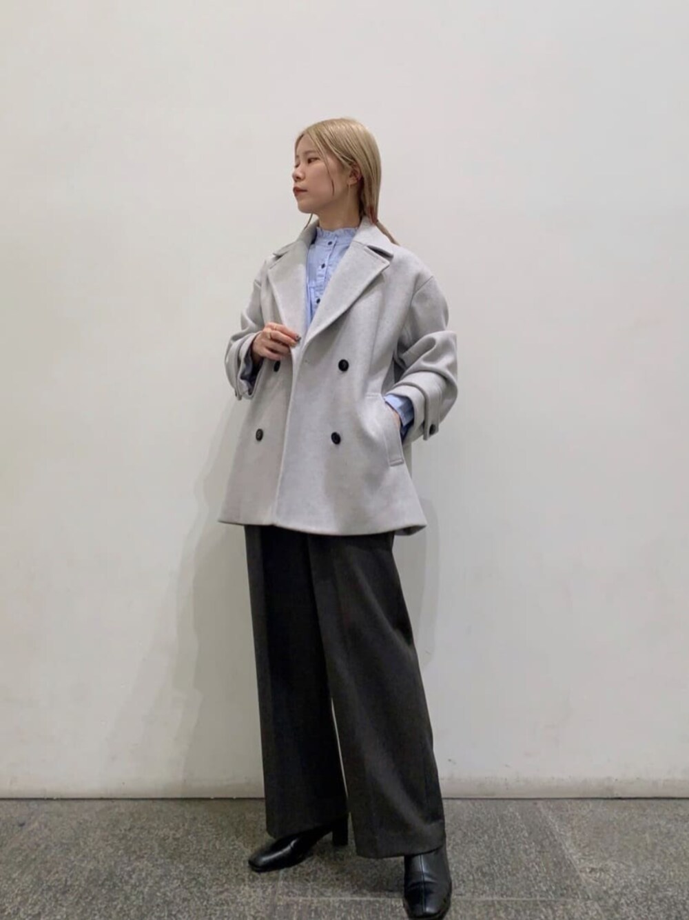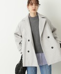 【アウター】王道のPコート オーバーサイズですが、品のある素材できれいめ見えします。大きめの襟効果でお顔周りもスッキリと見えます。156cm Mサイズ着用 【スタイリングポイント】絶妙におしゃれ見えするグレーカラーのパンツ×ライトブルーのカラー合わせでスタイリングしてみました。※パンツ156cm Mサイズ着用