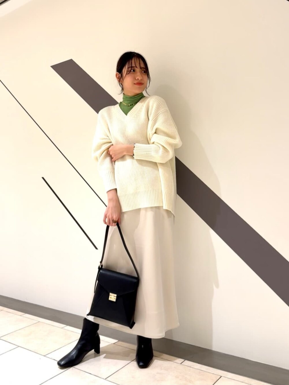 〇 Vネック畦ニット ベーシックながら、ゆるっと感のあるシルエットがかわいいニットです♡ 【サイズ感】 Mサイズ 首元は鎖骨が見えるくらいの開き、丈感はおしりが隠れる長さです◎肩周りがゆったりなので、中に薄手のインナーやブラウスもレイヤードしやすいです♪ 【素材】 チクチク感のない、サラッとした肌触り。 生地もしっかりとしているので、インナーの透け感も気になりません◎ 【コーディネート】 ホワイトのスカートに鮮やかなグリーンのインナー合わせで、冬から春にかけて着たいフレッシュなコーディネートにしてみました✿ ニット1枚では首元が開くのが心配…という方は、ハイネックのインナーやTシャツ合わせがオススメですよ⋆* staff: 20代前半/161cm/イエベ春/骨格ナチュラル