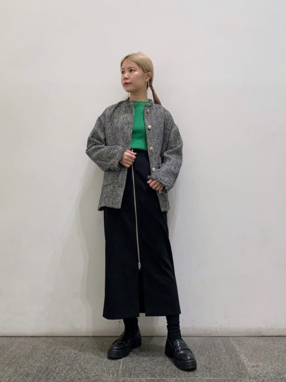 SALE品と新作のmixコーデです。春や秋にご着用頂けるツイードジャケットもSALEになっており、今getされるのがとてもお得です。156cm Mサイズ、グレー着用です。新作のスカートも、Mサイズ着用です。ブラックの無地のスカートは、長年履いて頂けますので、便利です。