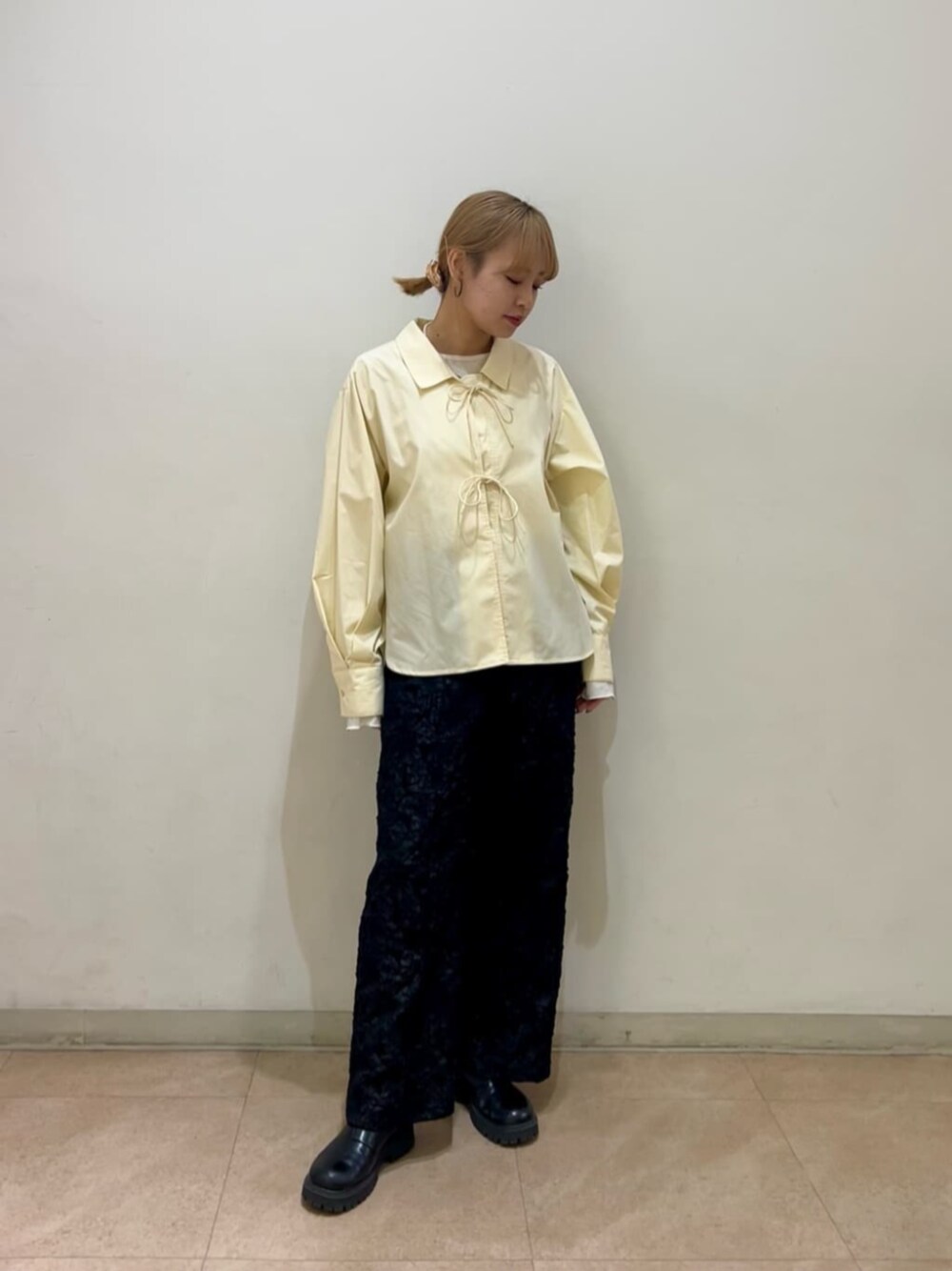 今から着れる春物アイテム☺︎ フロントのリボンがシンプルなコーディネートのポイントに。首元もゆとりがあるので、まだ寒い時期にはインナー合わせがオススメです◎ 柔らかいイエローで春を先取りできます♪