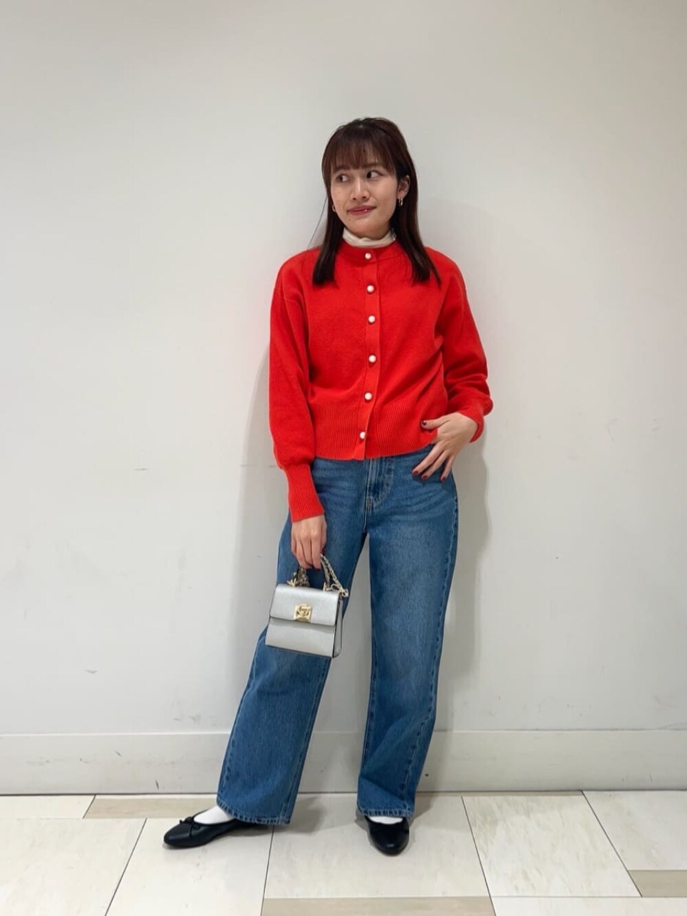 【着心地・サイズ感】カーデは大きなパール釦が上品みえします。鹿の子編みの生地感なので着心地も柔らかい印象でお召し頂けます。 デニムは161cmでM着用していますが、少しルーズなシルエットでヒップ周りにゆとりがあります。スッキリと着たい方はサイズダウンしても良さそうです☺︎!! 【スタイリングポイント】朱赤のカーデを主役にデニムでカジュアルMIXなスタイリングにしてみました!
