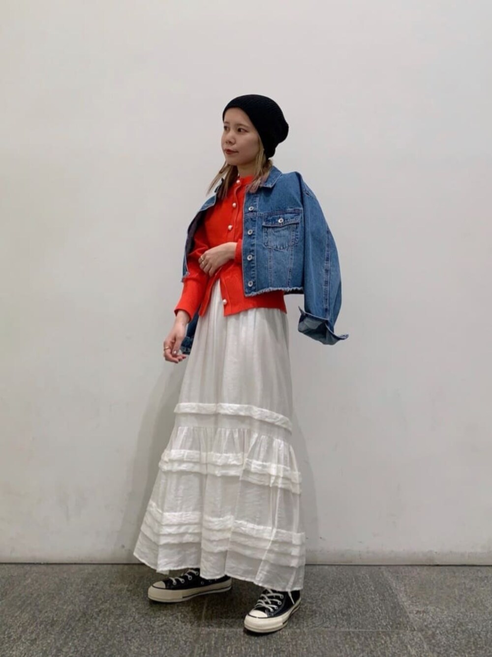 【スタイリングポイント】新作を使用したコーディネートです。少し早いですが、春先取りを意識してみました。新作のカーディガンは、大きいパールボタンがポイントで、とてもかわいいです。王道でデニムパンツ合わせもおすすめです。