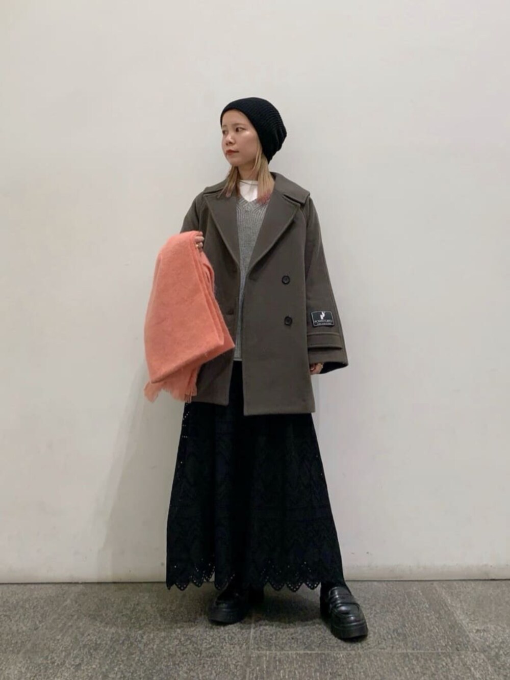 【スタイリングポイント】今すぐご着用頂けるウールコートが大幅にセールになっております! 絶妙に洒落感の出るカラーで、羽織るだけでコーディネートが決まります。新作のレーススカートで合わせてみました。ブラックですが、コットンレースで軽やかさが出るのが、ポイントです。是非セール×新作のmixでスタイリングしてみて下さい。