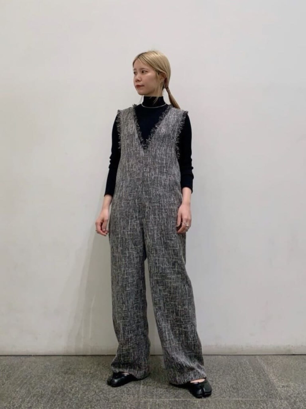 【スタイリングポイント】珍しいツイードサロペットです。ボトムス部分は意外と広がらないので、足元次第できちんと見えもするデザインです。TOPS部分はフリンジが施され、一枚で存在感たっぷりのサロペットです。王道にブラックのコンパクトニットで合わせましたが、フェミニンにリボン付きのブラウスや、カジュアルにロンT合わせもかわいいと思います。色々とスタイリングしてみてください!