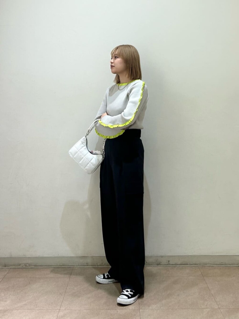袖フリルで新鮮な印象に。分厚くないニット素材で春先まで使える優れもの!袖がカーブするデザインなのでボトムスはコンパクトなスッキリとしたデザインがオススメです◎