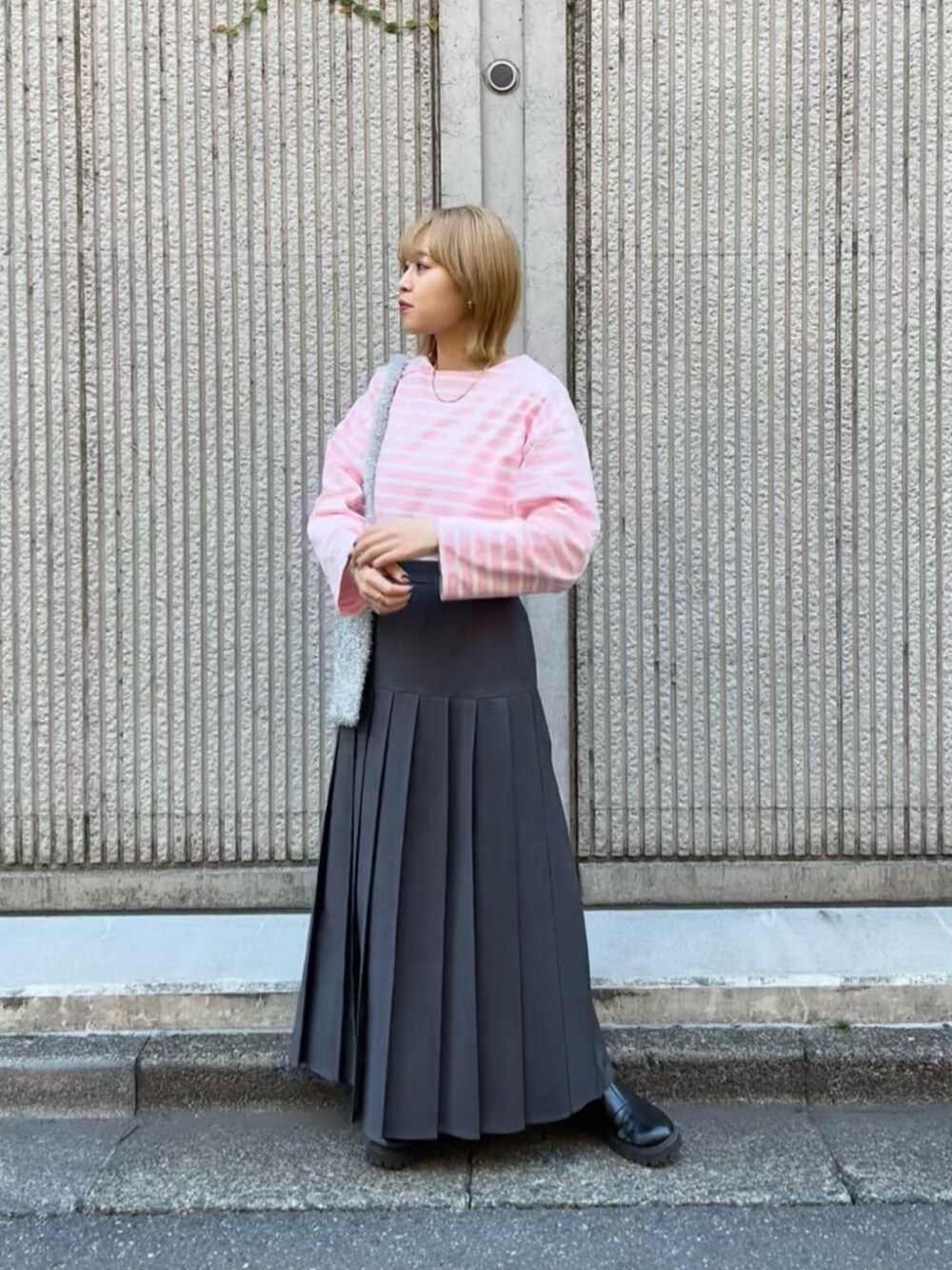 春に欲しいボーダーカットソー!デニムなどカジュアルなアイテムと合わせるのも勿論、フレアスカートとも好相性のボーダーはN.ならでは♡ ピンクのカラーがより春感を演出してくれます!スカートは広がりを抑えたプリーツで子供っぽくならず、どなたでも着やすいデザインです!