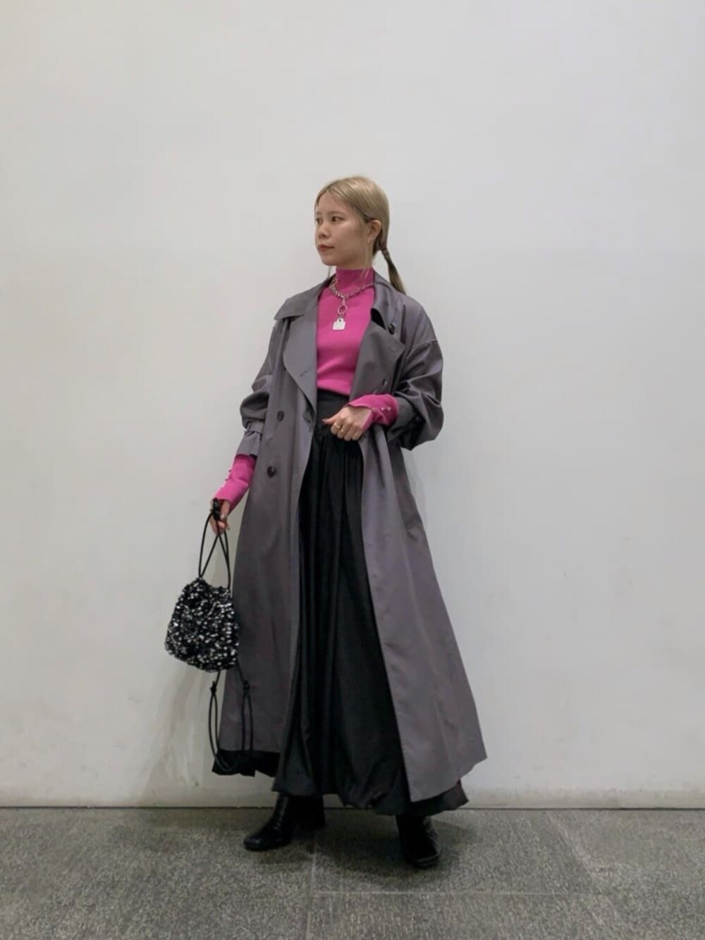【アウター】ゆったりシルエットでラフに羽織って頂けるトレンチコートです。トレンチと言えば、ベージュが王道ですが、ここは敢えてグレーカラーでこなれ感を出すのもおすすめです。156cm Mサイズ着用 【スタイリングポイント】ビビットなピンク色で、ワンポイントにしました。スカートは裾が少しバルーンシルエットになっていて、特にウエストのシルエットが本当に綺麗で細見えするので一度お試しくださいませ。
