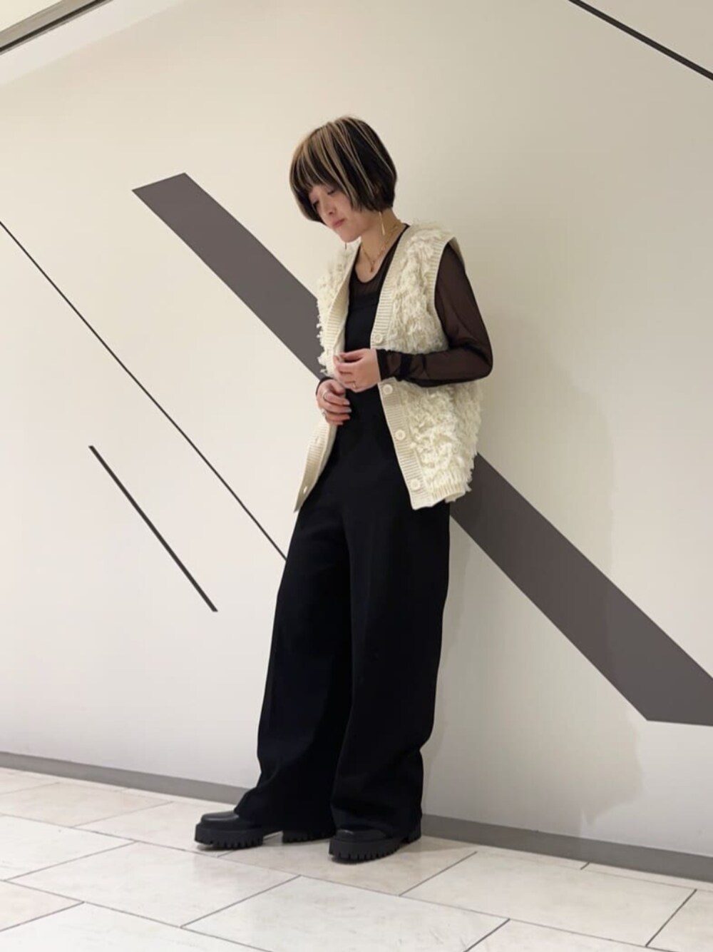ベアサロペットという名前通り、背中がゴム仕様でフィットしてくれるオールインワンは、意外とありそうでない仕様です☺︎インナーがもたつかずにスッキリ着れて安心感のあるオールインワンです。春トレンドのシアーインナーを合わせましたが、少し肌見せ部分が多く感じて気になったので、フリンジベストを合わせてみました!モードな印象になって体型カバーにもバッチリでオススメです◎インナーをボーダーのロンTや、ブラウス等合わせても印象変えて着ていただけます☺︎