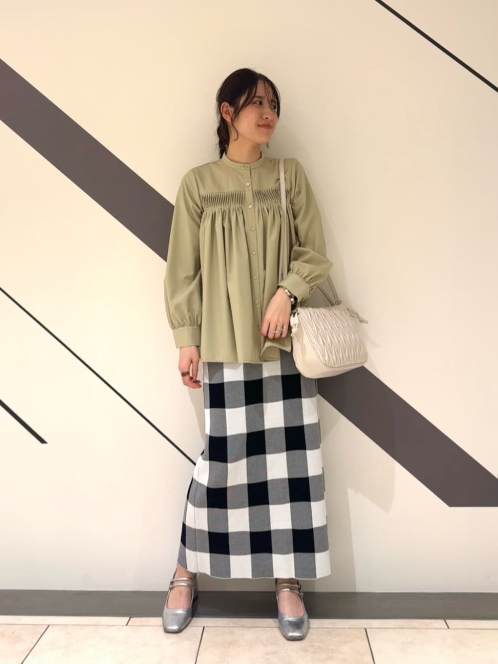 ○フロントボタンタックブラウス 前にも後ろにもあしらわれた細かなタックデザインが華やか見えする1枚。 パリッとした生地感でサラサラとした肌触り。たっぷりのギャザーが入っていて、シワ感も気になりにくいデザインです◎ パッと目を引く大柄のギンガムチェックスカートと合わせ、ブラウスをちょっぴりカジュアルに取り入れてみました♡ ゆったり着られる楽ちんコーデなので、暖かくなってきたお花見にもピッタリです❁ staff: 20代前半/161cm/イエベ春/骨格ナチュラル
