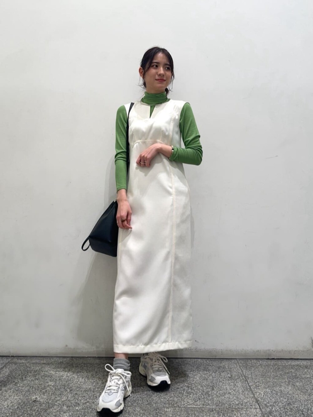 高め位置のビスチェラインが脚長効果バツグンのスタイルアップワンピ♡ ホワイトデニム×グリーンが甘さもありつつ春の爽やかな雰囲気を出してくれます◎ 縦長のラインで細見えですが、ストレッチのきいた素材なのでゆったり着られ、中にニットやブラウスをインしてロングシーズン着回ししていただけますよ♪ staff: 20代前半/161cm/イエベ春/骨格ナチュラル