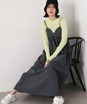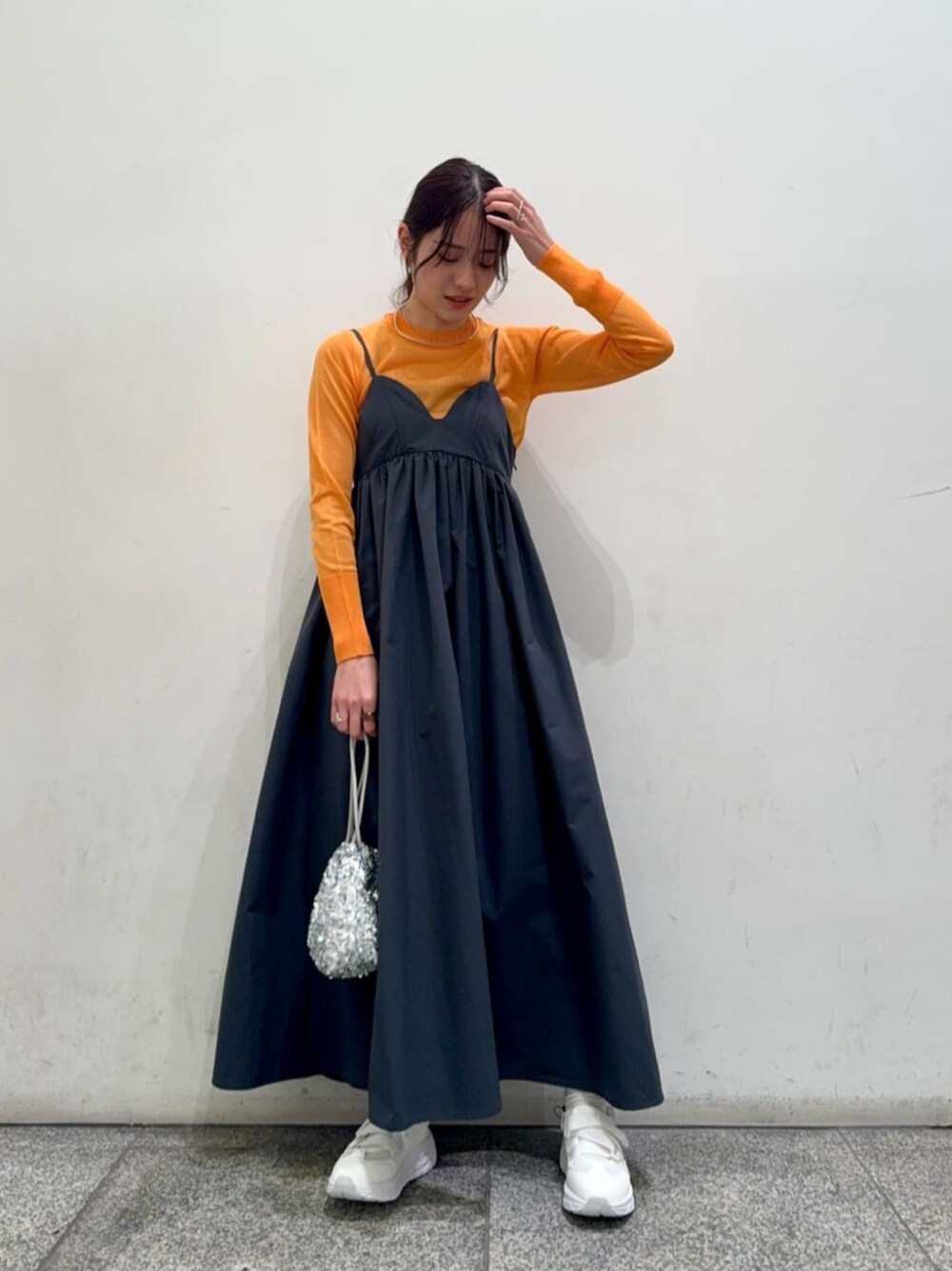 目を引くポップなオレンジのシアーニットに、落ち着いたグレーを合わせ、オシャレ見え間違いなしの春コーデにしてみました♫ dress:サラサラとドライな質感の生地で、上半身はスッキリ、下半身はボリュームのあるシルエットがラインを拾わず、スタイルアップして見えます♪ストラップ部分で長さの調節もできますよ◎ inner:さりげないラメが入ったストレッチの少ない生地で、ジャストなサイズ感がスッキリ見えします♡ staff: 20代前半/161cm/イエベ春/骨格ナチュラル