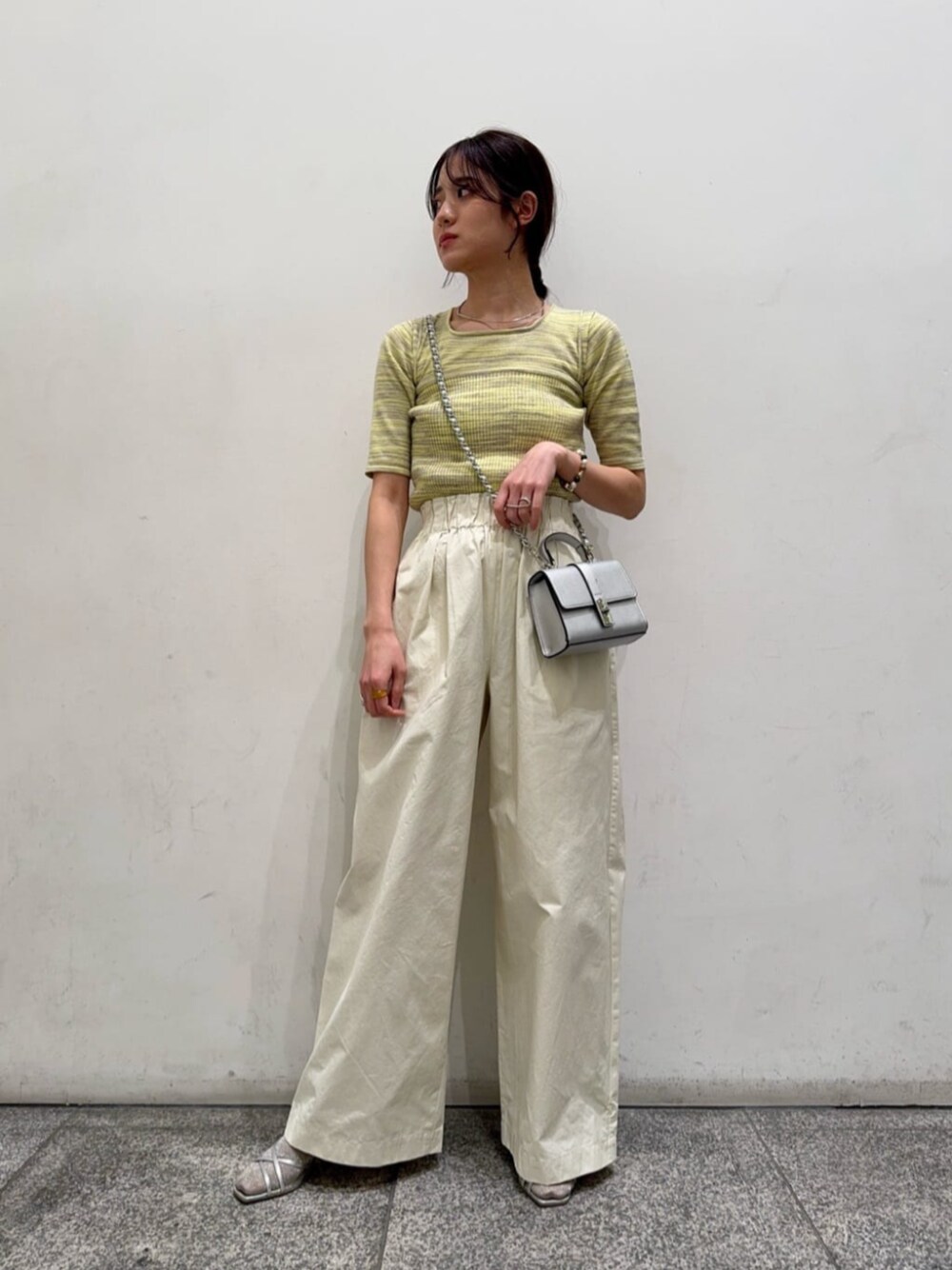 イエロー×グレーのミックスカラーなニットとホワイトのワイドパンツで柔らかな春っぽカラーのコーデにしてみました♡ knit:滑らかな肌触りで、タイトなシルエット。スクエアネックがデコルテをしっかり見せてくれます♪ bottom:ウエストはしっかり絞ってくれますが、腰から下はワイドなシルエットでゆるっとお召しいただけます。長めの丈感なので、ヒールのシューズと合わせるのがオススメです◎ staff: 20代前半/161cm/イエベ春/骨格ナチュラル