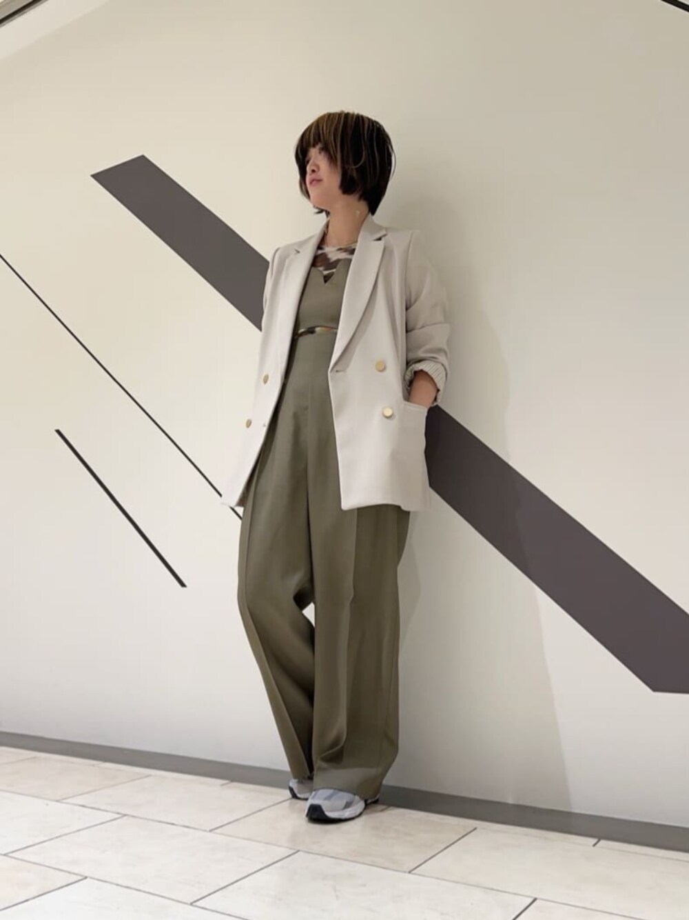 カットアウトデザインは意外と主張しすぎずさりげないので、着やすいサロペットです◎ワンサイズですが、157cmでスニーカー合わせできる丈感です。ゆったりめというより、上半身部分は女性らしくフィット感があります。ウエストは少しフィットして、脚周りはゆったりしています。サロペットはカジュアルすぎて敬遠されてきた方におすすめの、大人サロペットです。店頭ナンバー1人気のジャケットで合わせてみました◎