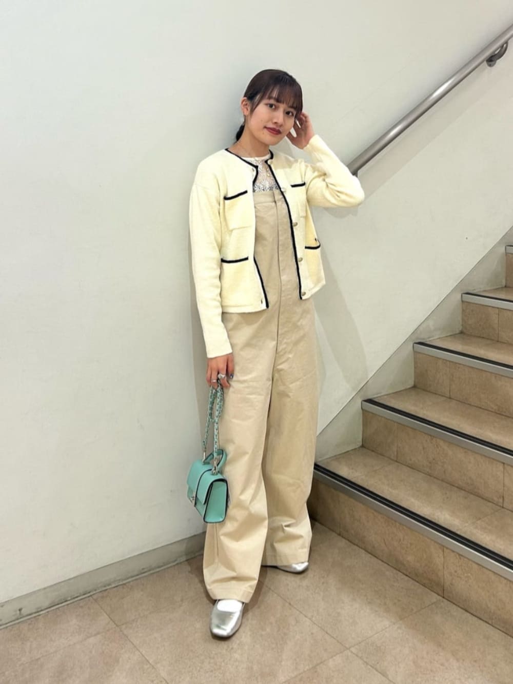 【着心地・サイズ感】今季トレンドが叶うロンパースは余裕あるゆるっとしたシルエットが可愛いです!161cmで裾つかないギリギリの着丈です!小柄な方は裾上げやヒールを合わせるのが安心です☺︎ カーデ:配色ラインが高みえします☆ふわっとした肌触りで着心地も抜群です! 【スタイリングポイント】春っぽワントーンコーデです。差し色でミントグリーンを取り入れ爽やかな印象プラスしています!