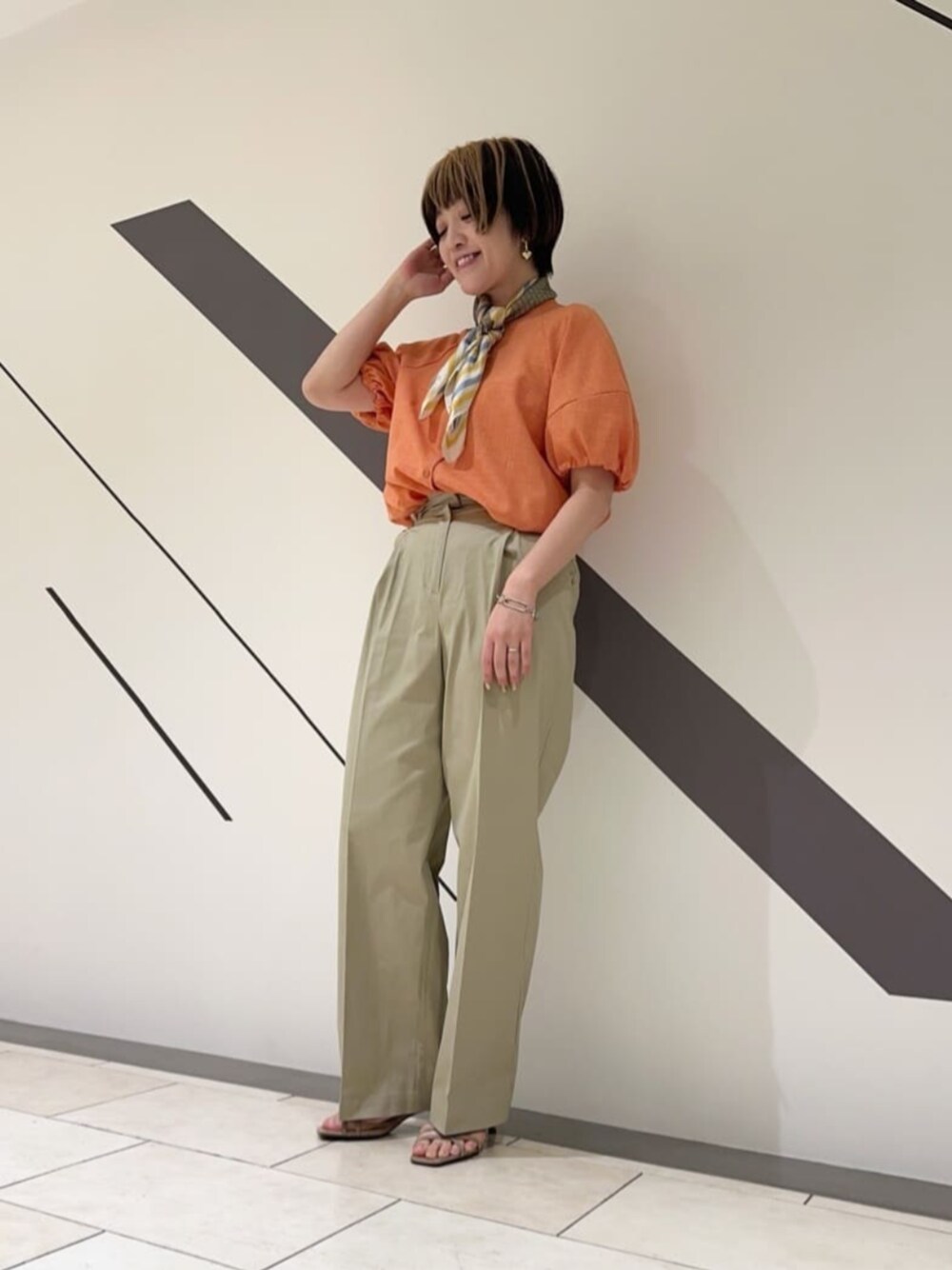 ランタンスリーブが可愛らしいブラウスが入荷しました◎選ぶカラーによって雰囲気が変わります♩普段づかいにはオレンジ、お仕事づかいにはライトグリーンもおすすめ。スカーフをプラスすると一気に華やかに!!首元に付けるのに抵抗がある方は、バッグに巻くのも可愛いです☺︎ストレートラインのパンツは、カジュアルな素材感ですがタックが入っているので、大人っぽく着ていただけます!157cmでMサイズ着用です◎