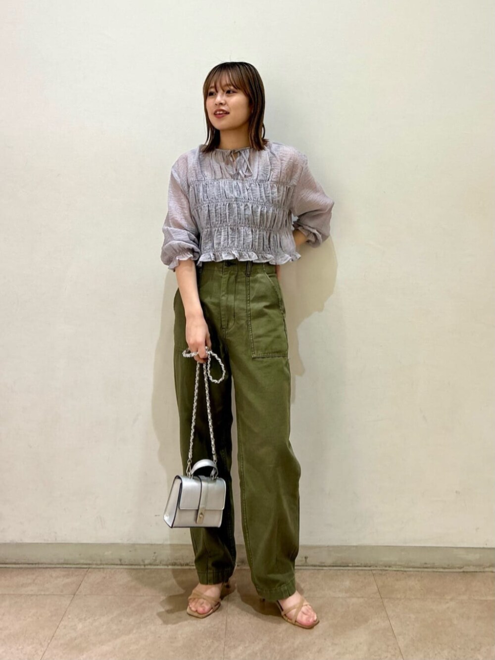 グレー×カーキが新鮮で可愛い組み合わせ!程良い透け感がヘルシー♪ リボンやシュリンクのデザインでも大人なカラー展開で甘さも控えめ。N.ではデニムやチノパンとのスタイリングもオススメです!
