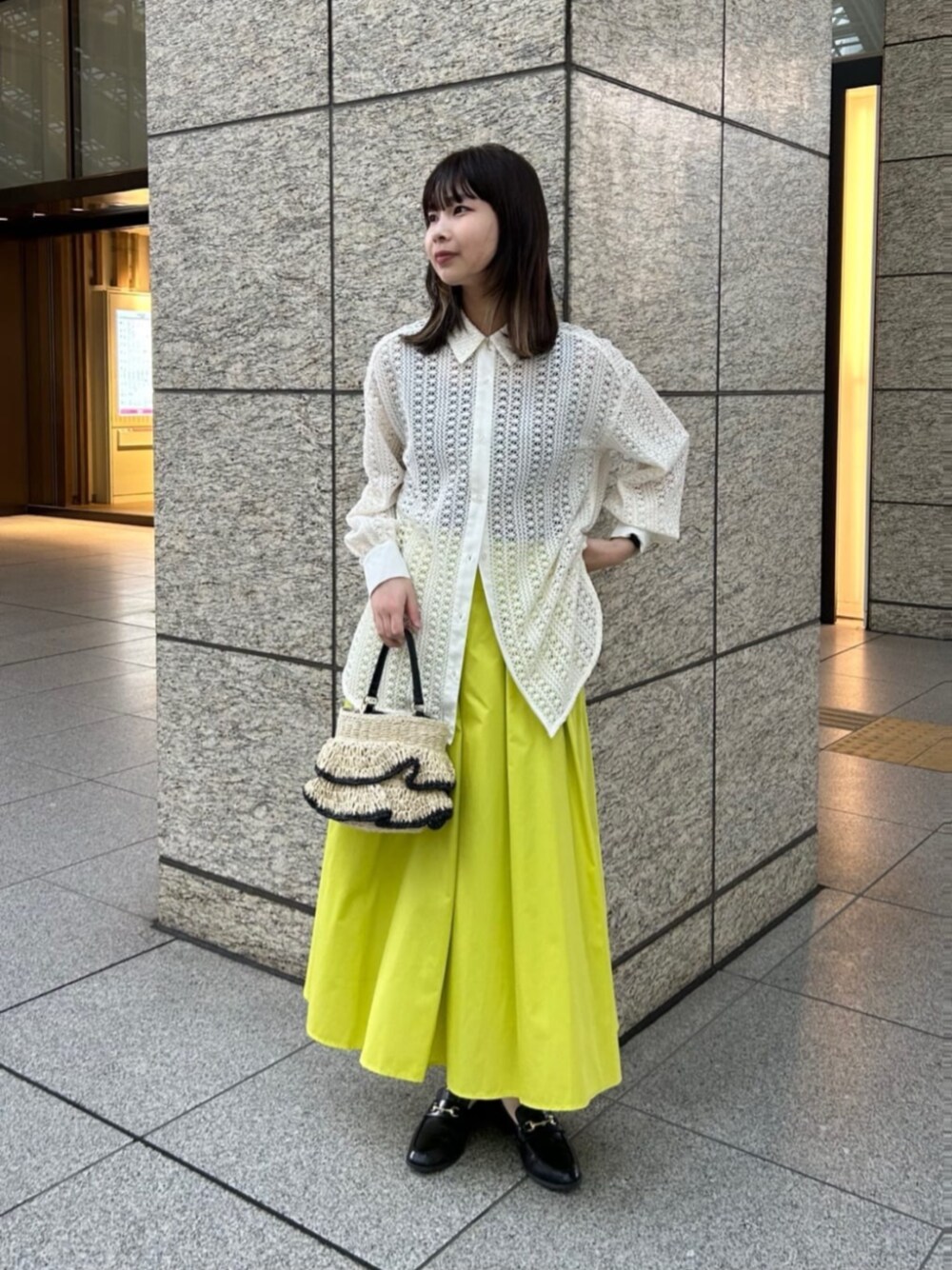 ・・切替ポプリンロングスカート・・ 【サイズ感】身長168cmの私で、足首が見える丈感です.!! 【着心地】ふわっと軽い、夏でも着心地抜群なスカートです!! 太めのウエスト切替ですが、後ろのゴムが柔らかくフィットするので、窮屈感がなく綺麗に着こなすことができました♡ 【スタイリングポイント】イエローのスカートを主役に、旬なレースシャツを合わせてみました♡ シャツのボタンを4つほど外して着ることが、大人な抜け感が出るワンテクポイントです☺︎