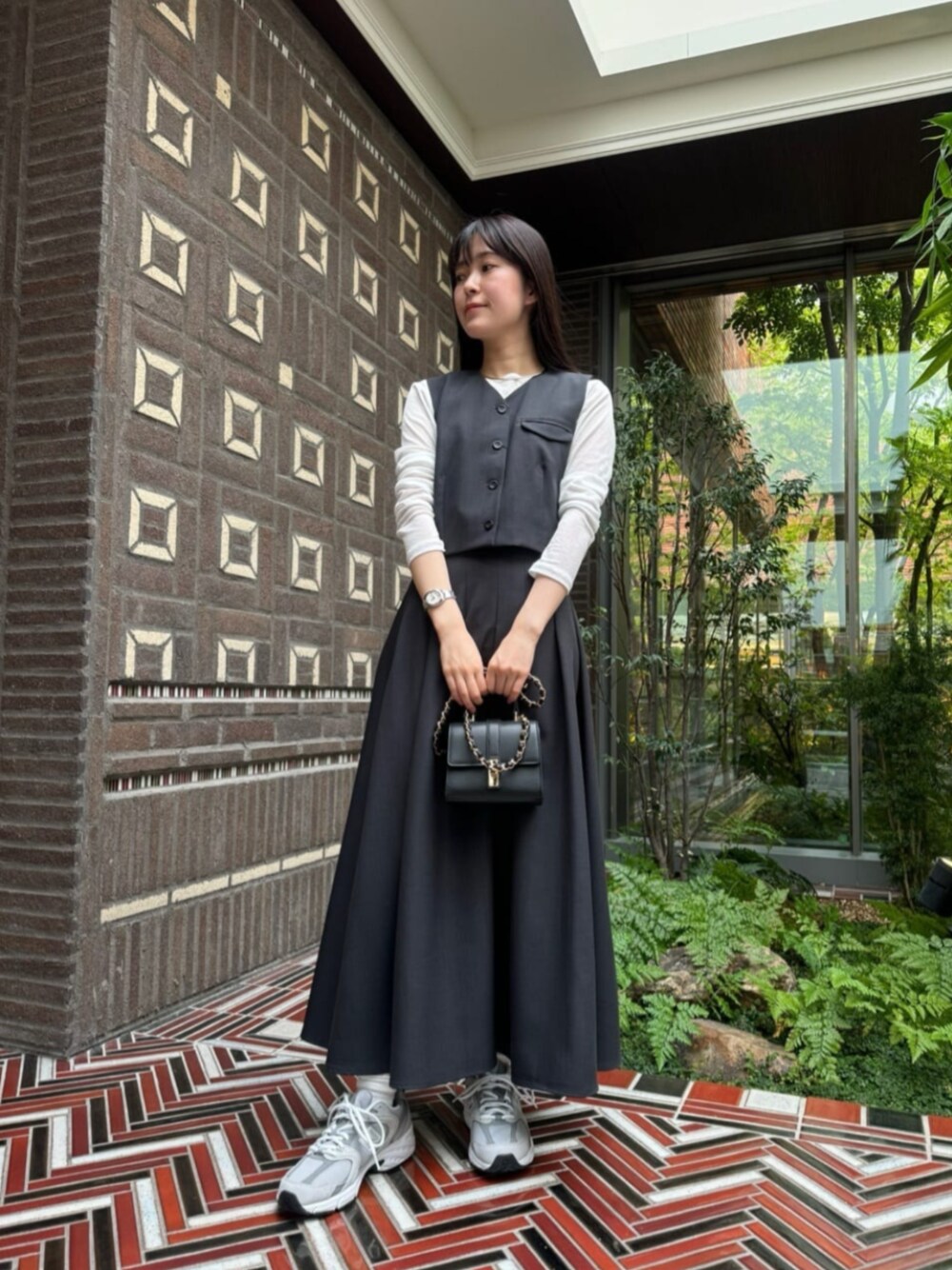 今年らしいクロップドジレのセットアップ♡ セットアップで着るだけでさまになり、単体でも活躍してくれるアイテムたち︎︎☺︎ シアーのトップスにスニーカー合わせでカジュアルなコーディネートにしました! ジレがクロップド丈なので小柄な方にもオススメです♪♪ ※159cmでMサイズ着用。スカートの丈感は踝くらいです。
