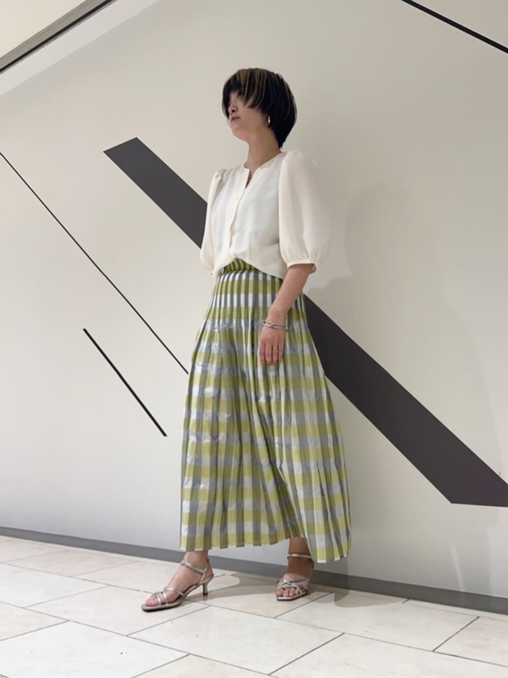 肩幅を華奢に見せてくれるボリュームスリーブのブラウス。着丈が短めなので、インもしやすいですがアウトでもすっきり着られます。着映えするチェックのスカートはリバーシブル仕様で、もう片面はストライプです(2色展開ですが、ストライプの面は色が同じです) ウエストが総ゴムなので楽な履き心地。ワンサイズですが折ったりしても違和感なく履けるので、低身長の方にもおすすめ。ブルベでも着やすい、オレンジ味が少ない爽やかなイエローです。