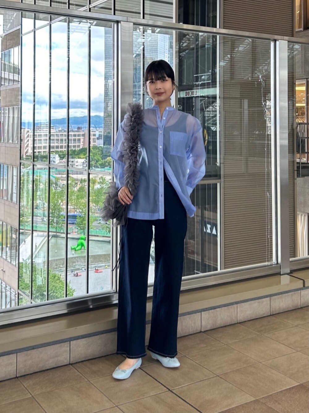 ・・バンドカラースリットシアーシャツ・・ 【サイズ感】身長168cmの私で、お尻がすっぽり隠れる丈感です.!! 【着心地】サラッとハリのある素材で、肌に張り付く感じがなかったです!とにかく軽く、シルエットもリラックス感があるので、夏にぴったりです☺︎ 【スタイリングポイント】ブルー系でまとめた大人リラックスコーデ♡ ボタンを上2つ,下3つほど開けることが抜け感のあるワンテクポイントです!!