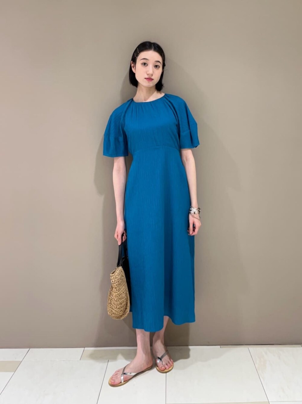 【着心地・素材感】一見シンプルに見えますがジャガード柄で存在感出るワンピースです♩袖がランタンのように膨らんでいますが、スカート部分はボリュームが出ないのでガーリーすぎずにお召しいただけます! 【サイズ感】身長167cmでMサイズ着用 着丈がスッキリしているので足さばきしやすいです◎ 【スタイリングポイント】 ブルーと素材感を主役にした夏のキレイめ休日コーデです♡