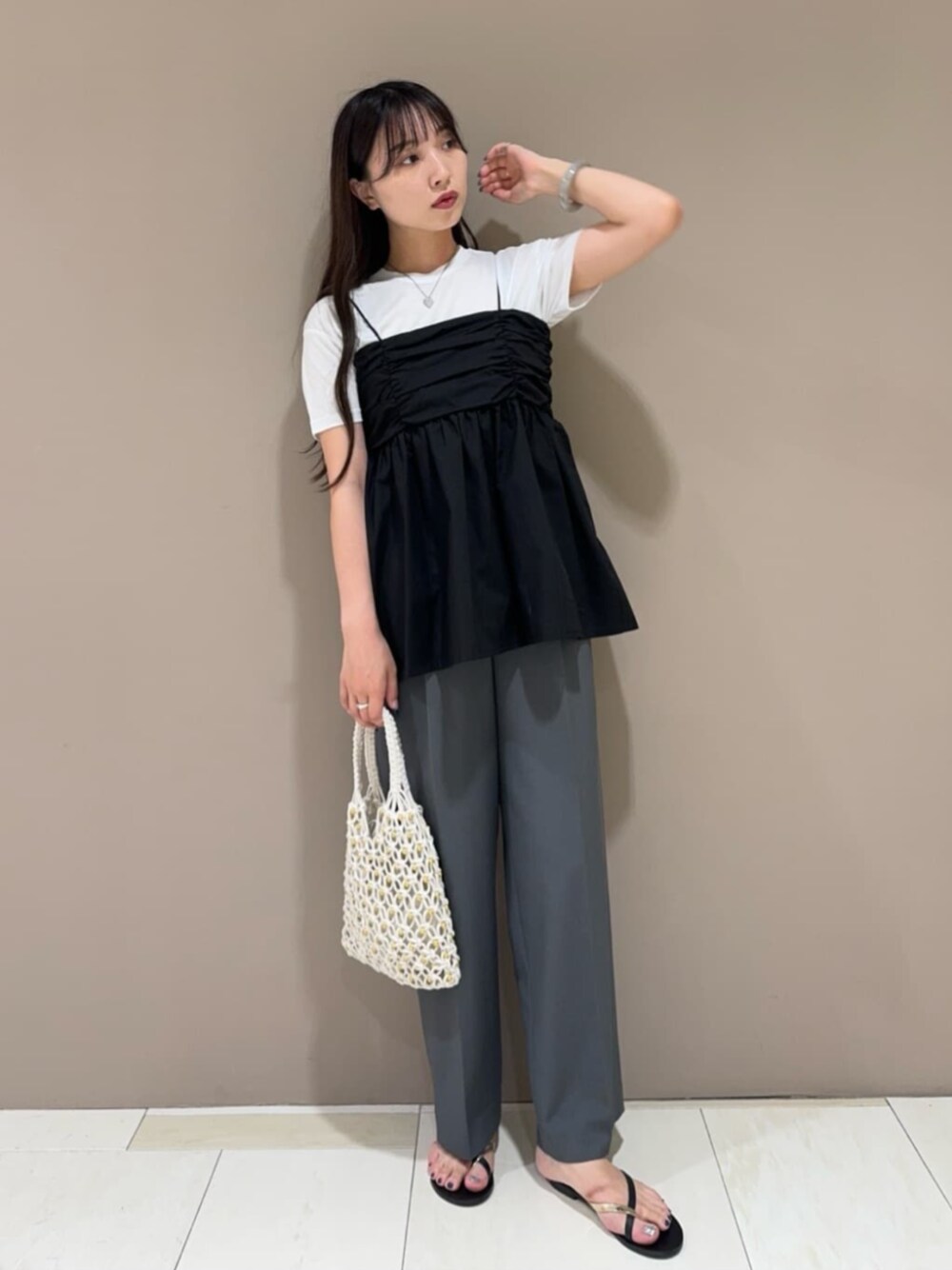 シアー半袖Tシャツ・・・少し透け感のある肌触りのいいTシャツです!1枚で着ても程よくゆったりしているのでシンプルに着ていただけます☺︎キャミのインナーやシャツのインナーにも最適です♪ ギャザーキャミビスチェ・・・胸元のギャザーが1枚でおしゃれな印象になります♡胸元はピッタリ見えると思うのですが後ろはゴムなのでかなり着やすいです!長さも長すぎず短すぎずちょうどいい丈感なのでワイドパンツやスッキリとしたシルエットのボトムどちらも合わせやすいです♪インナーにボーダーなどの柄のあるタンクトップを着ても可愛いです! ツータックライトワイドパンツ・・・シルエットがとにかく綺麗なパンツです!ワイドなシルエットにセンタープレスが入ってるのでゆったりしつつもスッキリ目に履いていただけます☺︎私の着用サイズがMサイズでしっかり長めの丈感になります! ------------------------- 身長:163cm 【普段サイズ】・トップス:M・ボトムス:M・シューズ:24.5 【着用サイズ】・トップス:M・ボトムス:M・シューズ:24.5 -------------------------